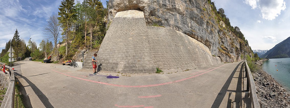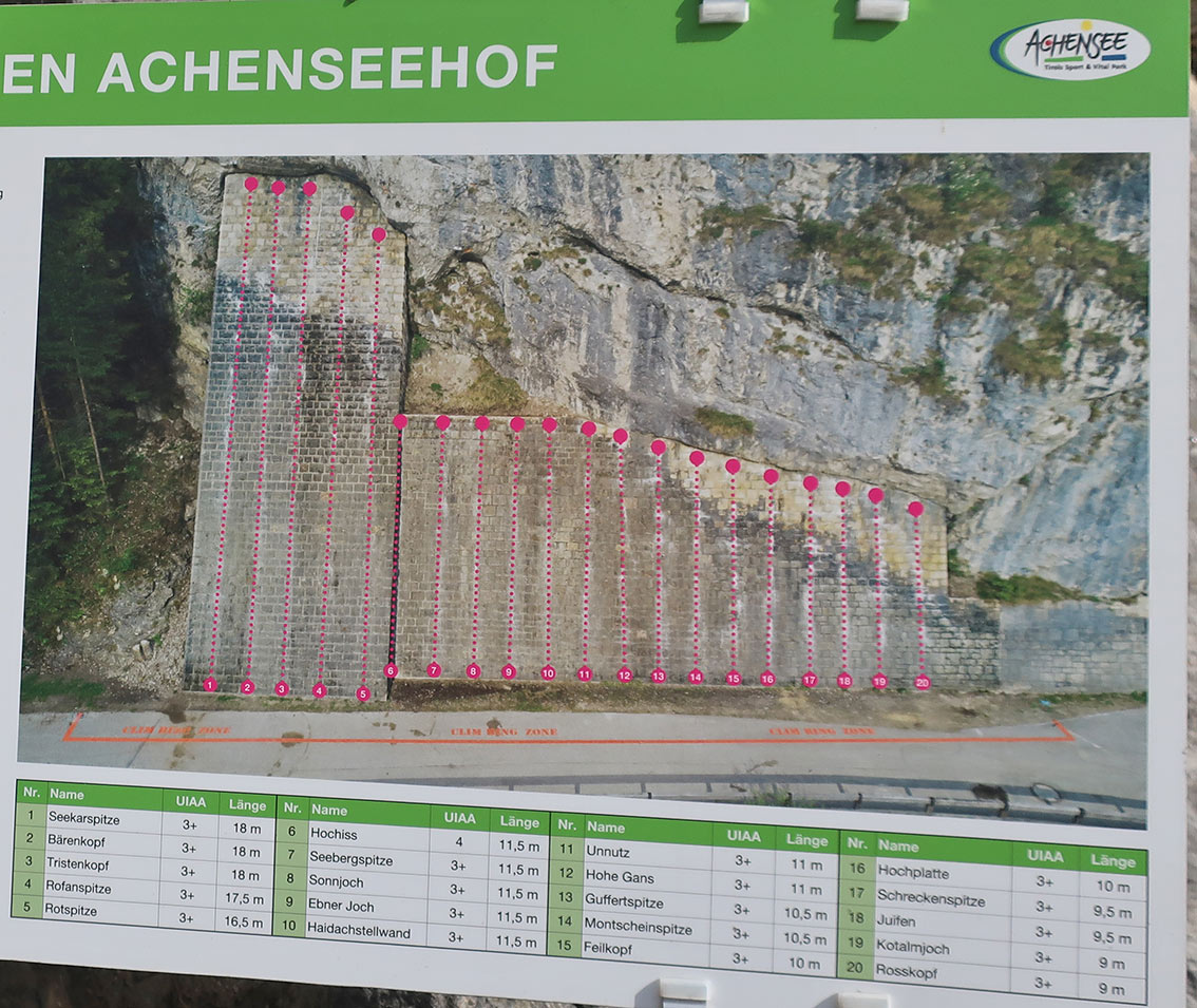 Kleiner Klettergarten an einer künstlich errichteten Natursteinmauer direkt am Ufer des Achensees. Der Klettergarten eignet sich für Anfänger-Kursbetrieb bzw. für Kinder, die ihre ersten Schritte am Fels (Natursteine an der Mauer) machen wollen. Die Routen sind alle sehr leicht 3+, nur eine ist 4 (die kleine Verschneidung).