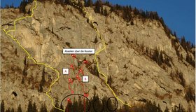 Als Zwischensicherungen und als Umlenker Kettenstände mit zwei Klebehaken und Stahlschraubkarabiner.