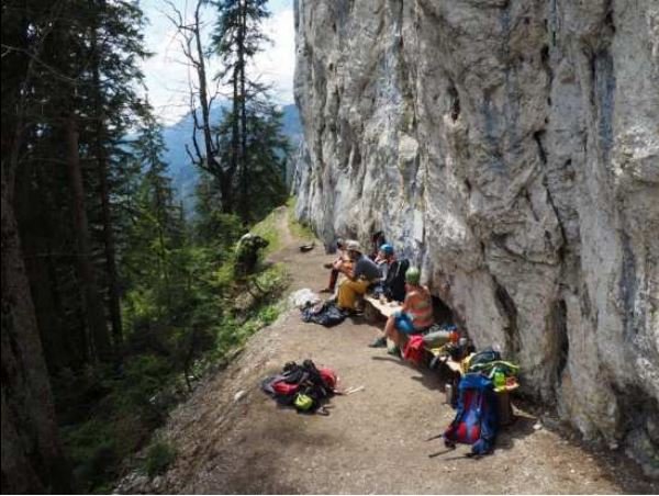 Vom Parkplatz dem markierten Weg über die Wiese und den Bach hinauf zum Einstieg folgen.