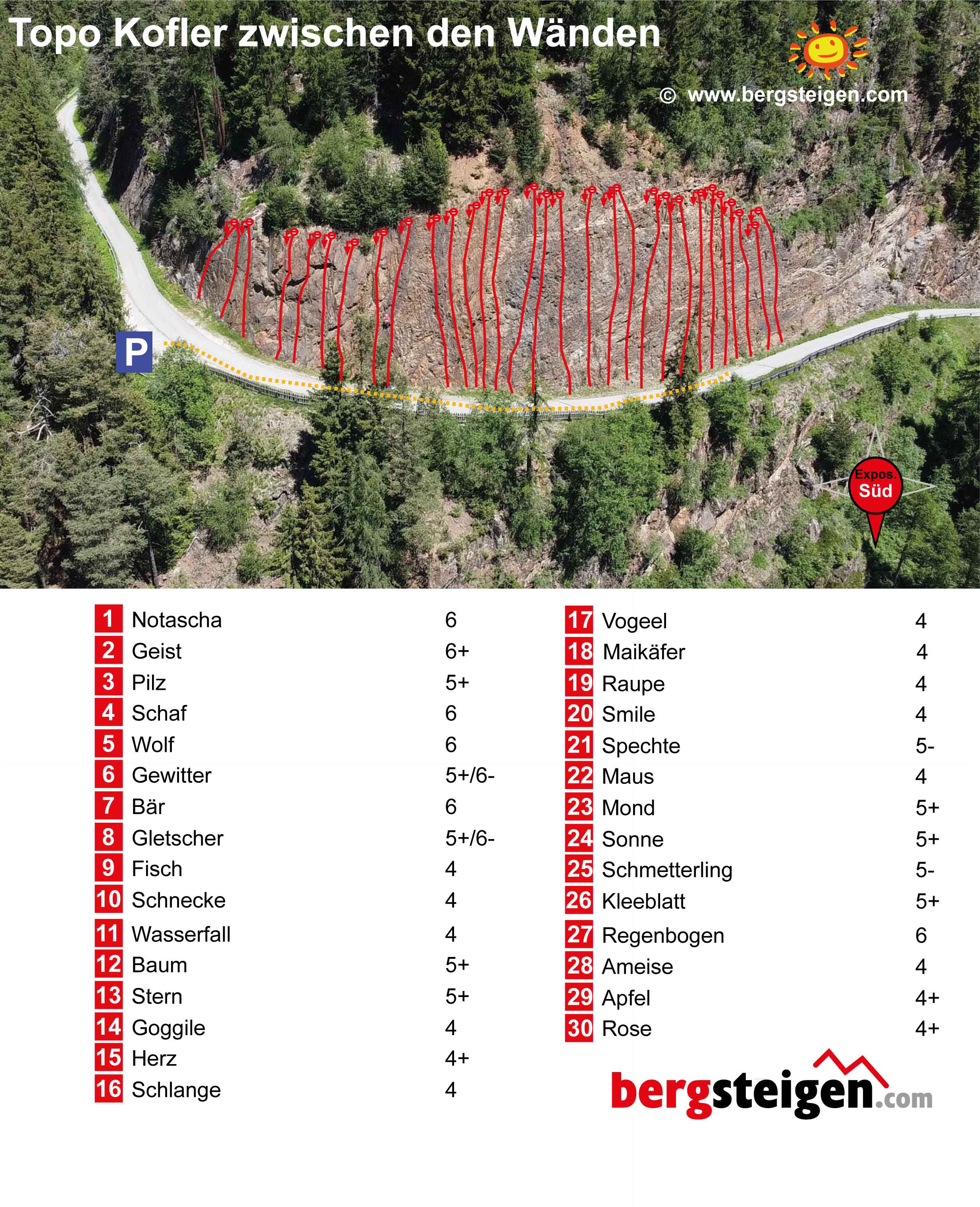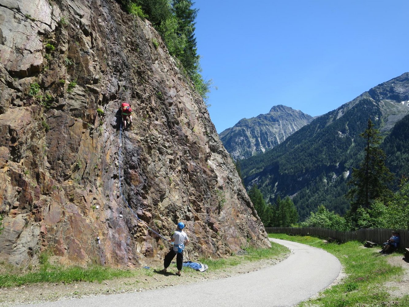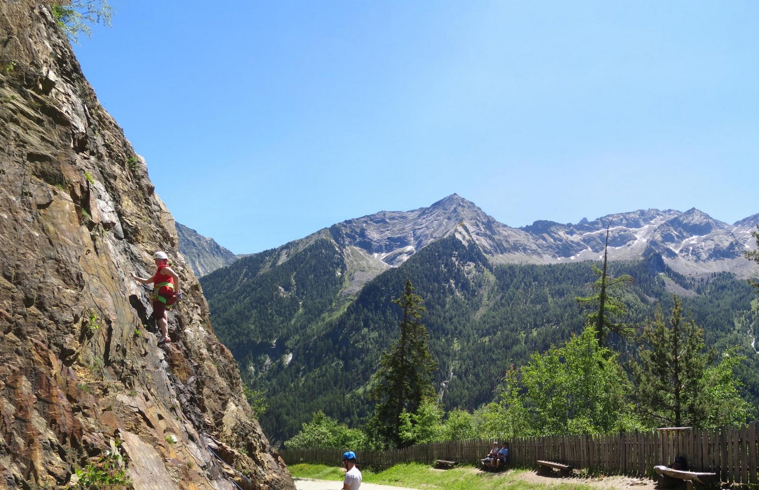 Sehr guter und sonniger Anfänger-Klettergarten vor dem Bergbauernhof Kofler. Kein Zustieg, nette Sitzbänke und eine großartige Aussicht laden hier zu den ersten Schritten am Fels ein.