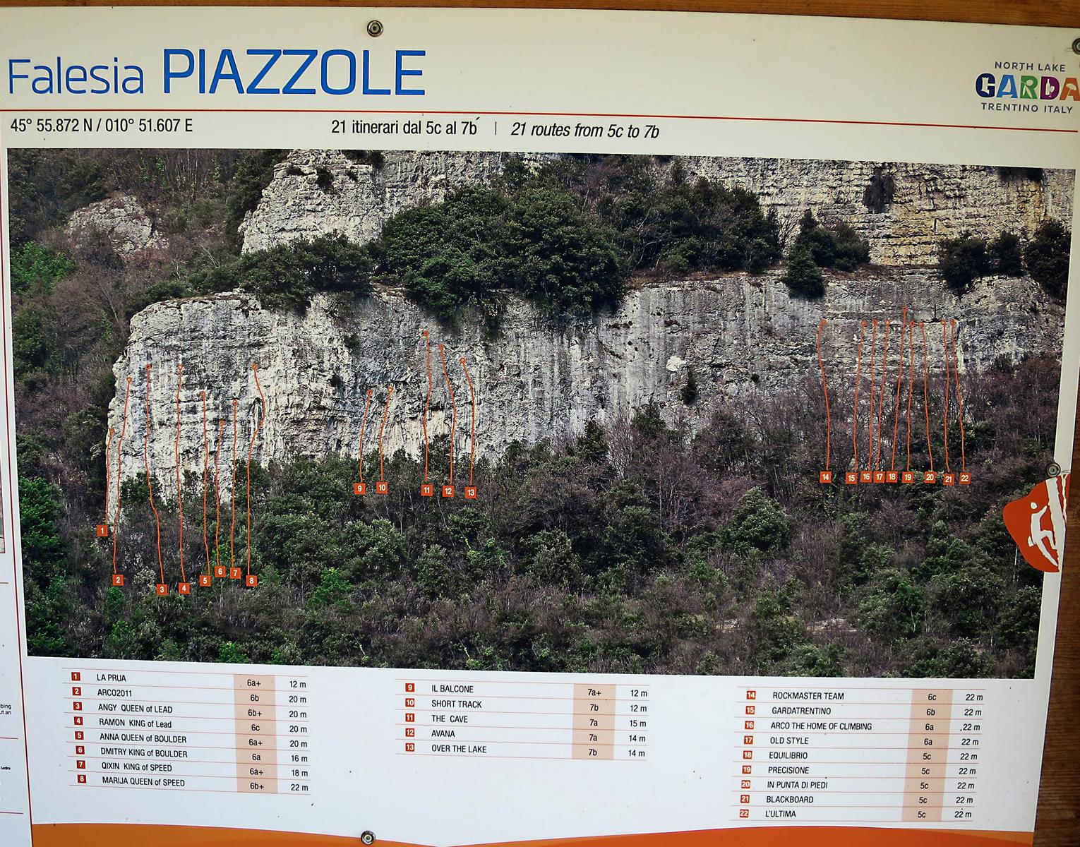 Die Falesia Piazzole ist ein sehr schöner und sonniger Klettergarten in der Nähe von Arco. Der Klettergarten befindet sich über dem Örtchen Varignano und ist rau, perfekt abgesichert und bietet großartige Routen im Bereich 6-8. Eine Perle unter den Klettergärten rund um Arco, mit viel Potenzial für Neutouren a la Massone im rechten Wandteil!