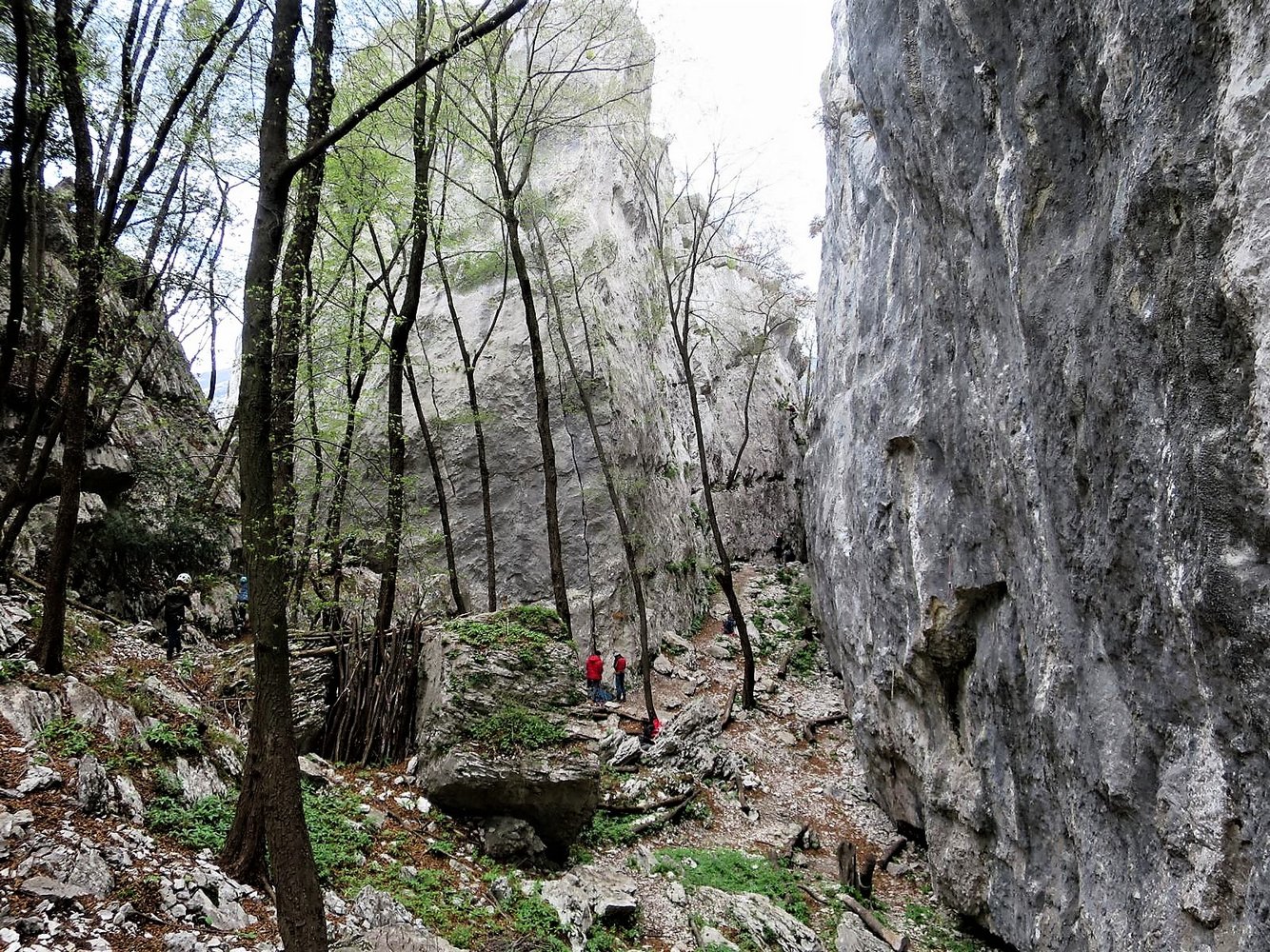 2) Vom oberen Parkplatz dem Weg 601 über die Wände folgen. Nach einem markanten Spalt erreicht man die Festungsanlage und kurz (100 -150 m) danach geht es rechts bei einem Steinmann in den Canyon. 15 Min.