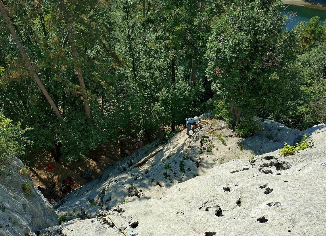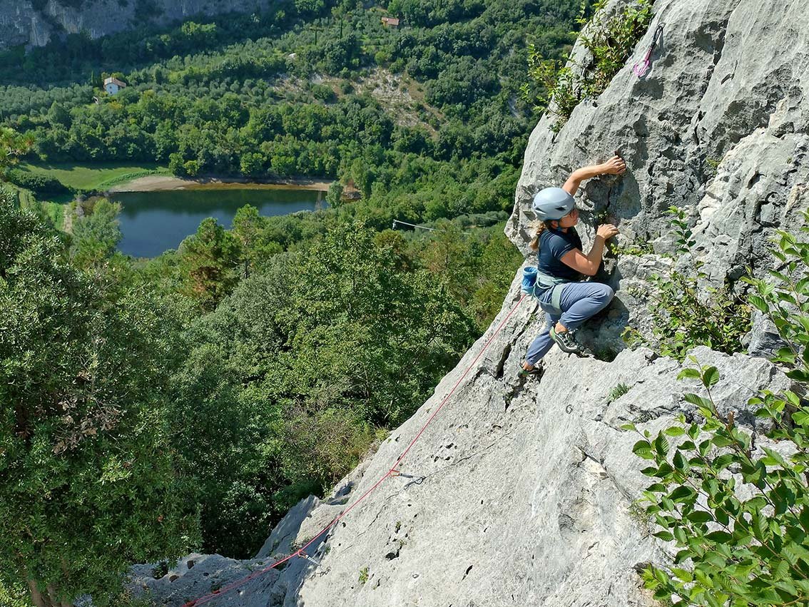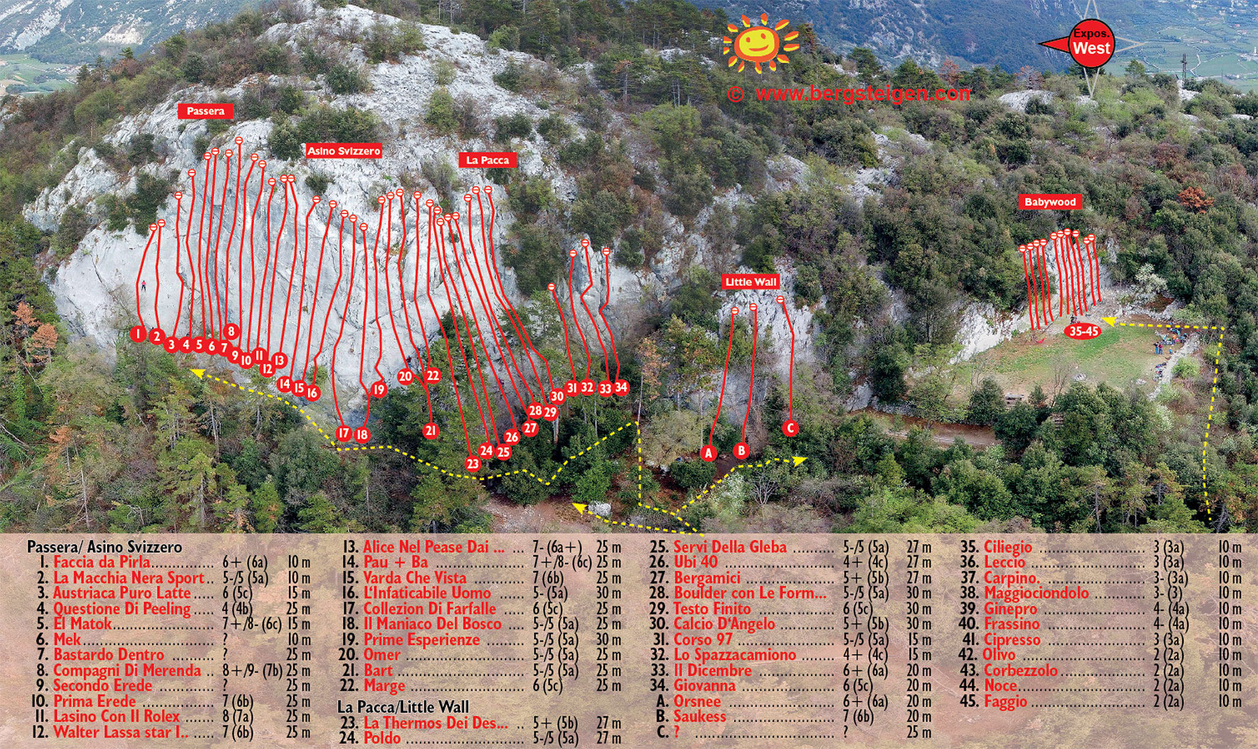 Bei der kleinen Kirche auf den rot-weiss markierten Weg "Sentiero dei Lecci" vorbei an drei Kreuzen in Richtung Colodri Gipfel. Nachdem der Weg eine Felswand auf einem Band gequert hat, geht links vor einem Baum mit zwei Markierungen ein Pfad waagrecht zu einer Holzstiege und zum Klettergarten ab (bzw. ist die Wiese mit dem Kinder-Klettergarten direkt vom Weg aus zu sehen).