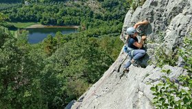 Kletterausrüstung, 15 Expressschlingen und Helm.