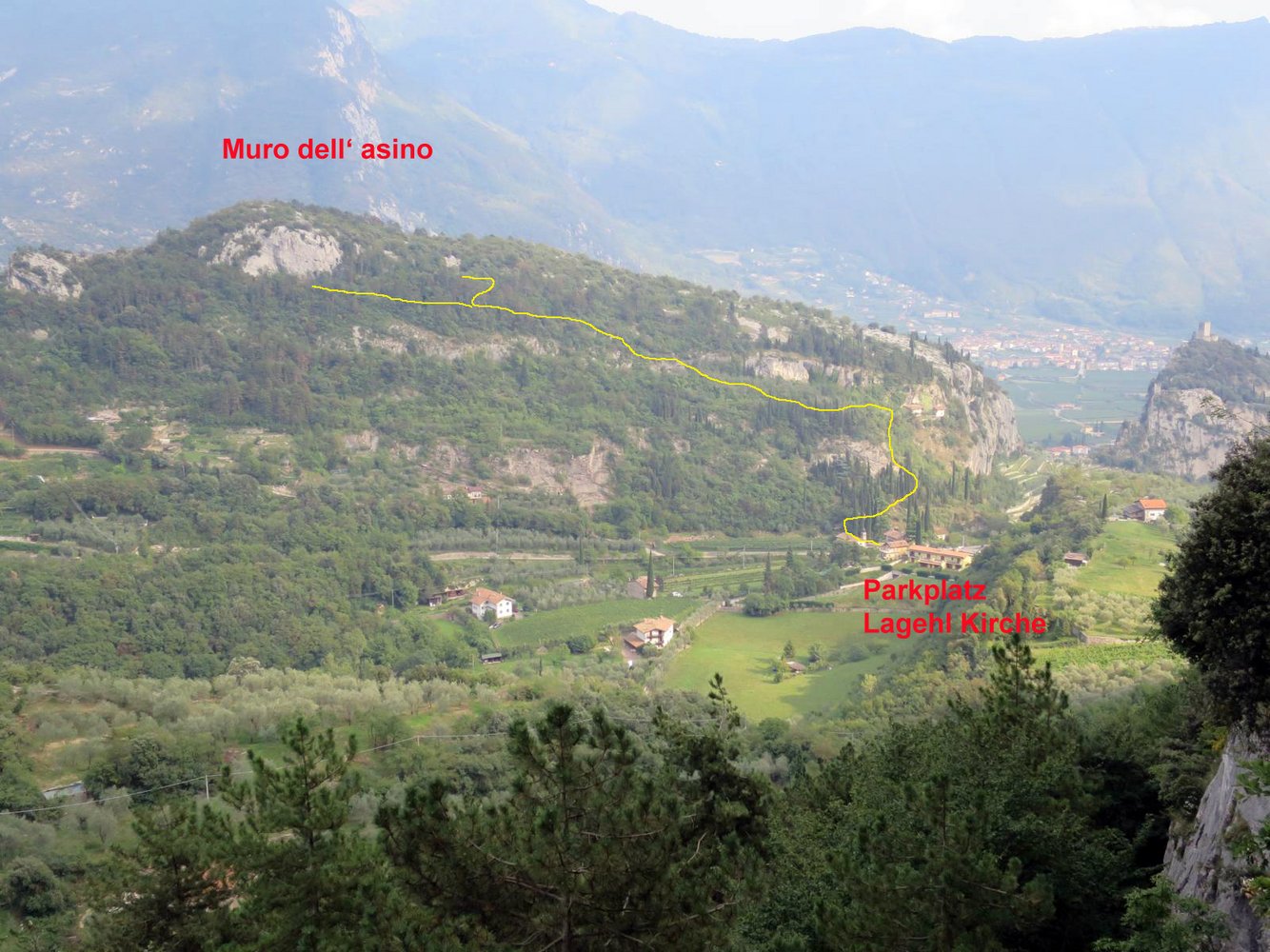 Im Zentrum von Arco folgt man der Straße Richtung Riva und biegt nach dem Park (Tafel) nach Laghel ab. Der Straße bis sich die Einbahnsysteme wieder vereinen folgen und bei der Kirche in Laghel parken. Wenn dieser Parkplatz voll ist, muss man wieder zurück nach Arco und beim Beginn der Einbahnen parken (plus 10 Min. Zustieg).