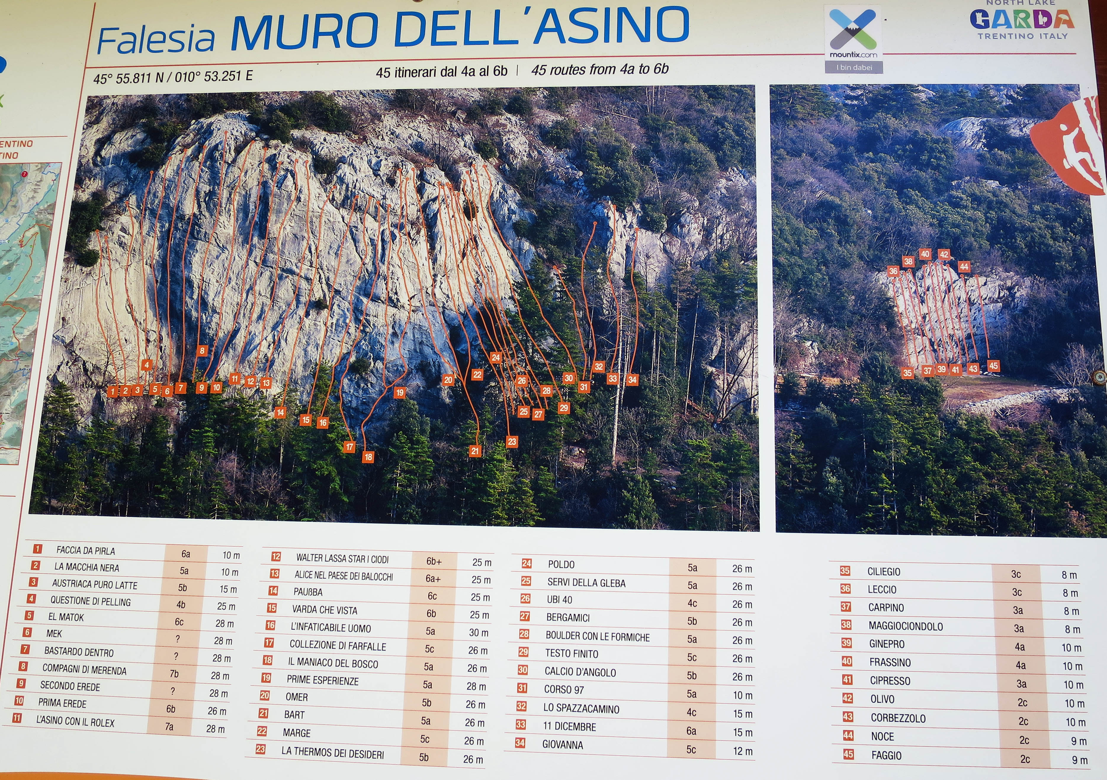 Die Falesia Muro dell asino ist ein schöner Klettergarten an der Westseite des Colodris im Lagheltal. Die vielen leichten Routen sind perfekt mit Bohrhaken und Umlenkern ausgestattet und bei Kursen sehr beliebt. Es gibt auch rechts einen eigenen Kindersektor Baby Wood. Aufgrund der westseitigen Ausrichtung ist das Gebiet am Nachmittag lang in der Sonne, wobei am Einstieg Bäume abschatten. Der Fels zeichnet sich durch wasserzerfressene, meist geneigte Wände aus.
