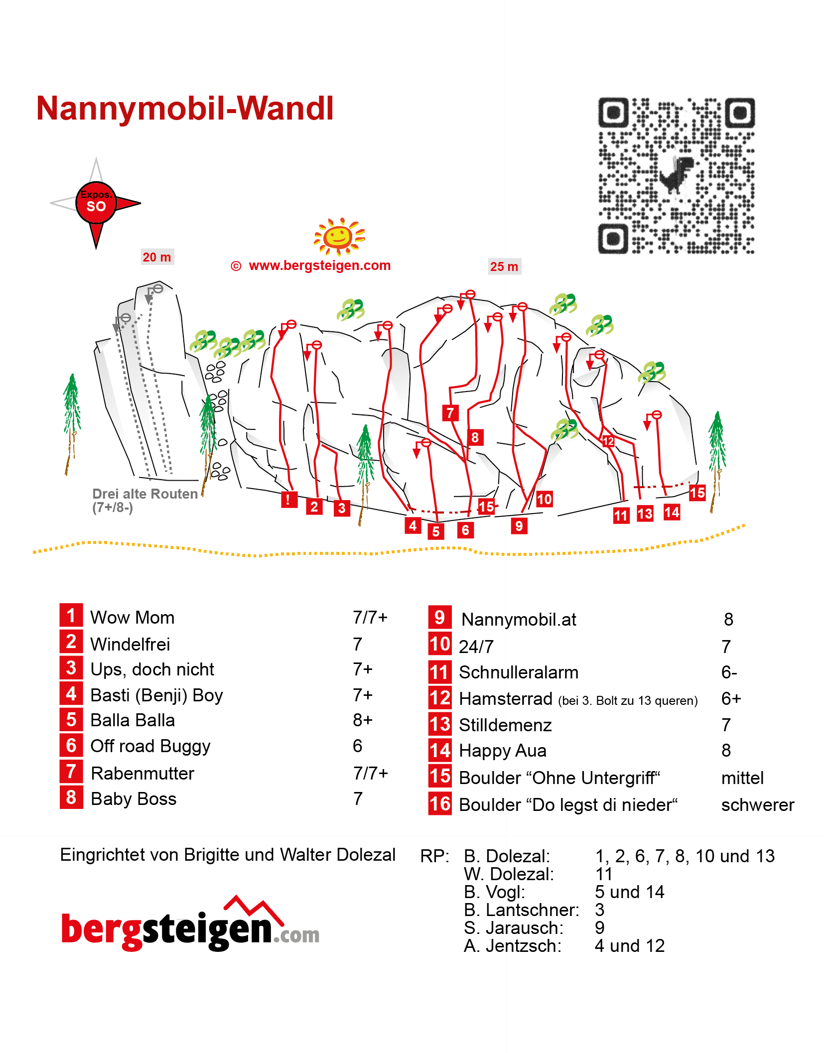 Vom sogenannten Teufelsgratparkplatz (am oberen Ende des Rahmhofweges bei Stollhof) die gelbe Markierung Richtung Leitersteig. 50m vor dem Leiterlsteig quert der blau markierte Wandfußsteig. Diesen 5min. nach rechts folgen. Nach Erreichen des Teufelsgrates noch ca. 50 m weiter waagrecht nach rechts zum sichtbaren Nannymobil-Wandl! Routennamen angeschrieben.