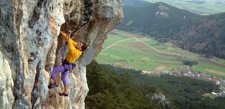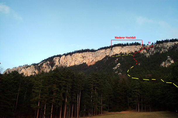 Der Niedere Hochfall ist das klassische Winterklettergebiet im Wiener Raum bwz. auf der Hohen Wand. Besonders reizvoll im Herbst, wenn man über dem Hochnebel*) auf knapp 1000 m im T-Shirt klettert. Leider ist der Einstiegsbereich nicht ganz optimal (für Kinder ungeeignet) und die Hakenabstände sind auch etwas weiter. Der Fels ist aber vom allerfeinsten und bietet steile Wandkletterei. 70m Seil!