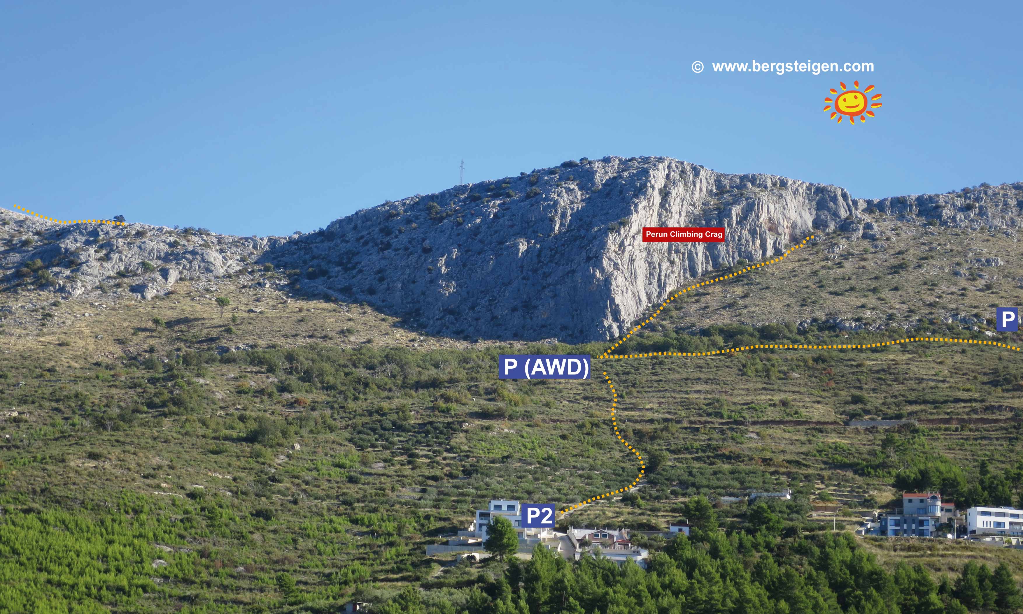 Von Split nach Strozanac Donji und hier steil in die Put Strarong sela Staße auffahren. Die Straße verlässt den Ort und nach zwei super steilen Kehren kommt rechts ein Parkplatz mit einer Tafel. Hier parken.
