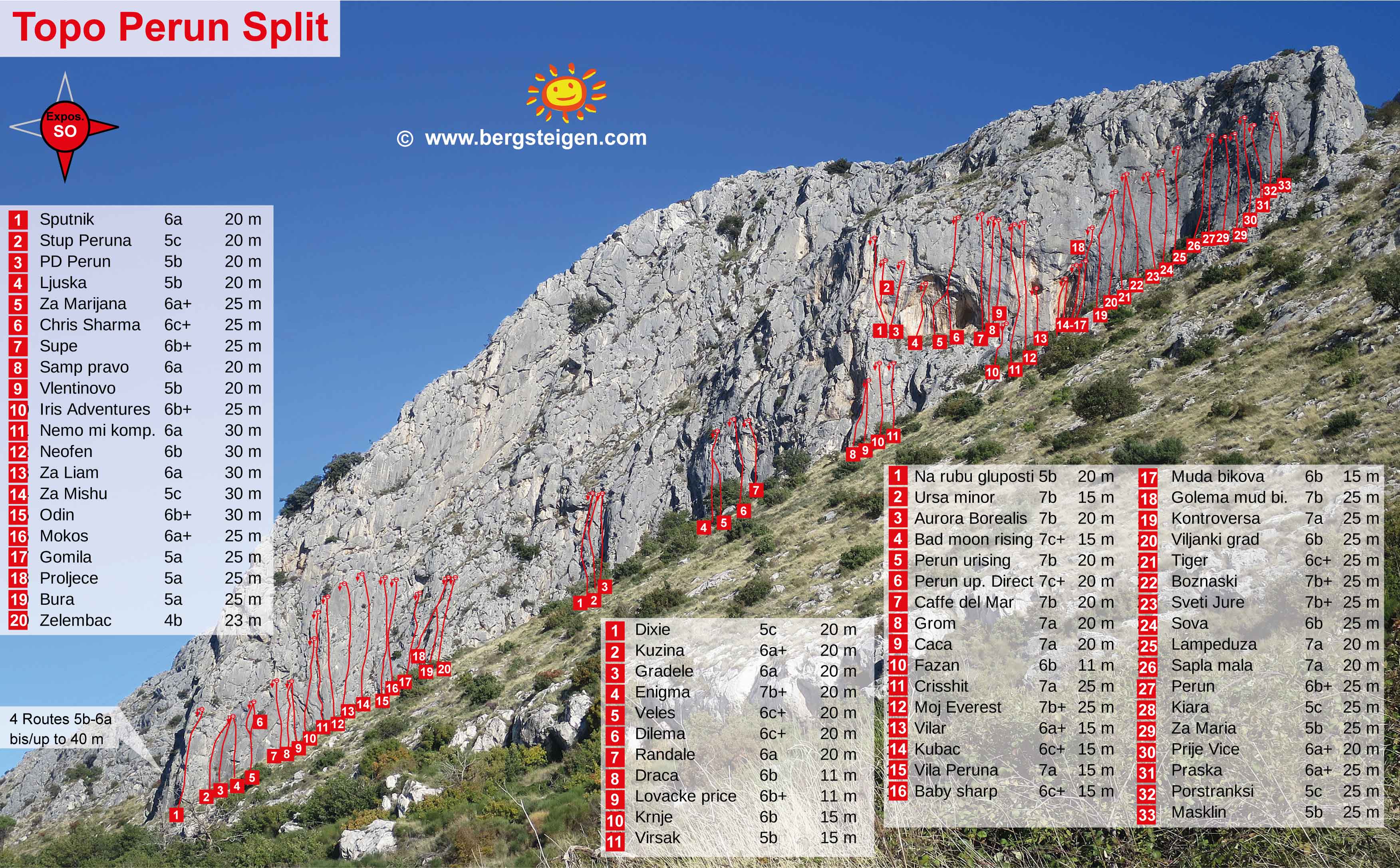 Schöner Klettergarten hoch über Split mit rd. 65 Routen. Der Fels ist perfekt, aber noch so wasserzerfressen wie in Omis oder Brela. Die Routen sind sehr gut abgesichert und teilweise auch mit Namensschildern am Einstieg ausgestattet. Die Kletterei ist primär plattig, aber es gibt auch steilere, sogar versinterte Touren in franz. 7ten Grad. Landschaftlich sehr schön und auch ruhig.