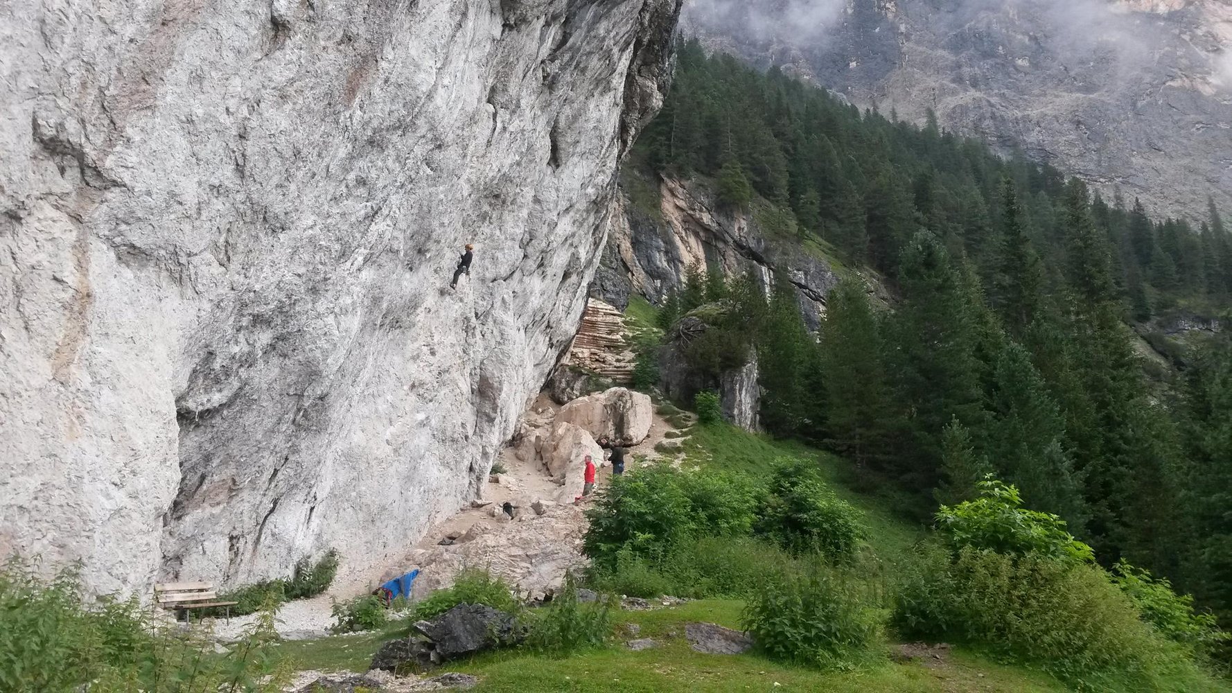 Eingebettet zwischen Piz Ciavazes und Pordoi liegt dieser großteils regensichere Klettergarten kurz oberhalb der Plan de Schiavaneis und bietet in drei Sektoren vor allem Ausdauerkletterei. Im ebenfalls fast regensicheren Sektor Placca (links) finden sich auch leichtere Touren zwischen 6 und 7. Ganz rechts gibt es auch noch wenige leichte Kurzrouten, dazwischen dominiert im Sektor Centrale aber Ausdauerkletterei an oft geschlagenen Griffen. Eine perfekte Alternative um an Regentagen zu klettern.