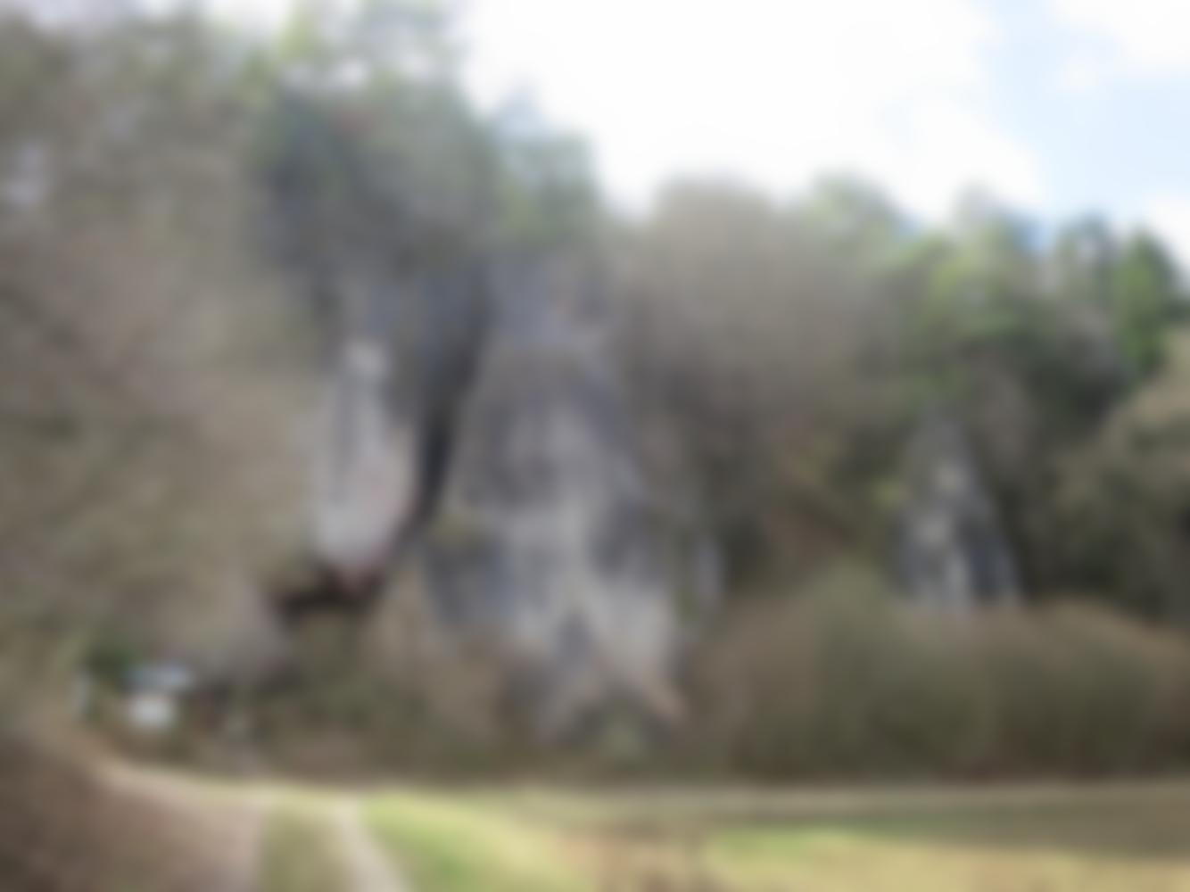 Vom Wanderparkplatz auf einem Forstweg in 5 Min. über die Wiese zu den bereits sichtbaren Felsen am Waldrand.