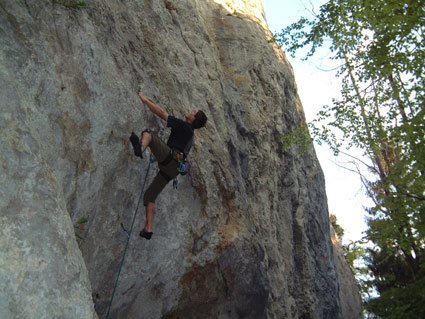 Dieser wunderschön gelegene Klettergarten im Salzkammergut bietet perfekte Touren, auch für den Anfänger. Die Routen sind meist neu mit Klebehaken eingebohrt und der Name und die Schwierigkeit am Einstieg auf einer kleinen Tafel angeschrieben (bei den älteren, meist schwereren Route ist dieses Täfelchen leider etwas hoch oben, und es kann schon vorkommen, daß man die Schlüsselstelle schon geschafft bevor man die Schwierigkeit und den Namen lesen kann...). Gleich am Anfang gibt es einen netten Sektor (mittleres Foto) der vor allem für Anfänger und Kinder perfekt eingerichtet ist. Hier läßt es sich also unbeschwert klettern, Haken manchmal im "1 Meterabstand". Etwas links vom Sektor mit den Kinderkletterrouten gibt es einige gute Ausdauerrouten, der Routenname "Schmalzbettler" ist aussagekräftig genug.