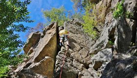 Vom Parkplatz geht bei der Brücke gehten orographisch liniks zwei Forststrassen ab. Jener (am Beginn Holztafel Burgsteig) die parallel zum Graben verläuft ca, 200 m nach Süden folgen und in einer Linkskehre (bei einer Eisenstange) auf Steigspuren zum Klettergarten absteigen