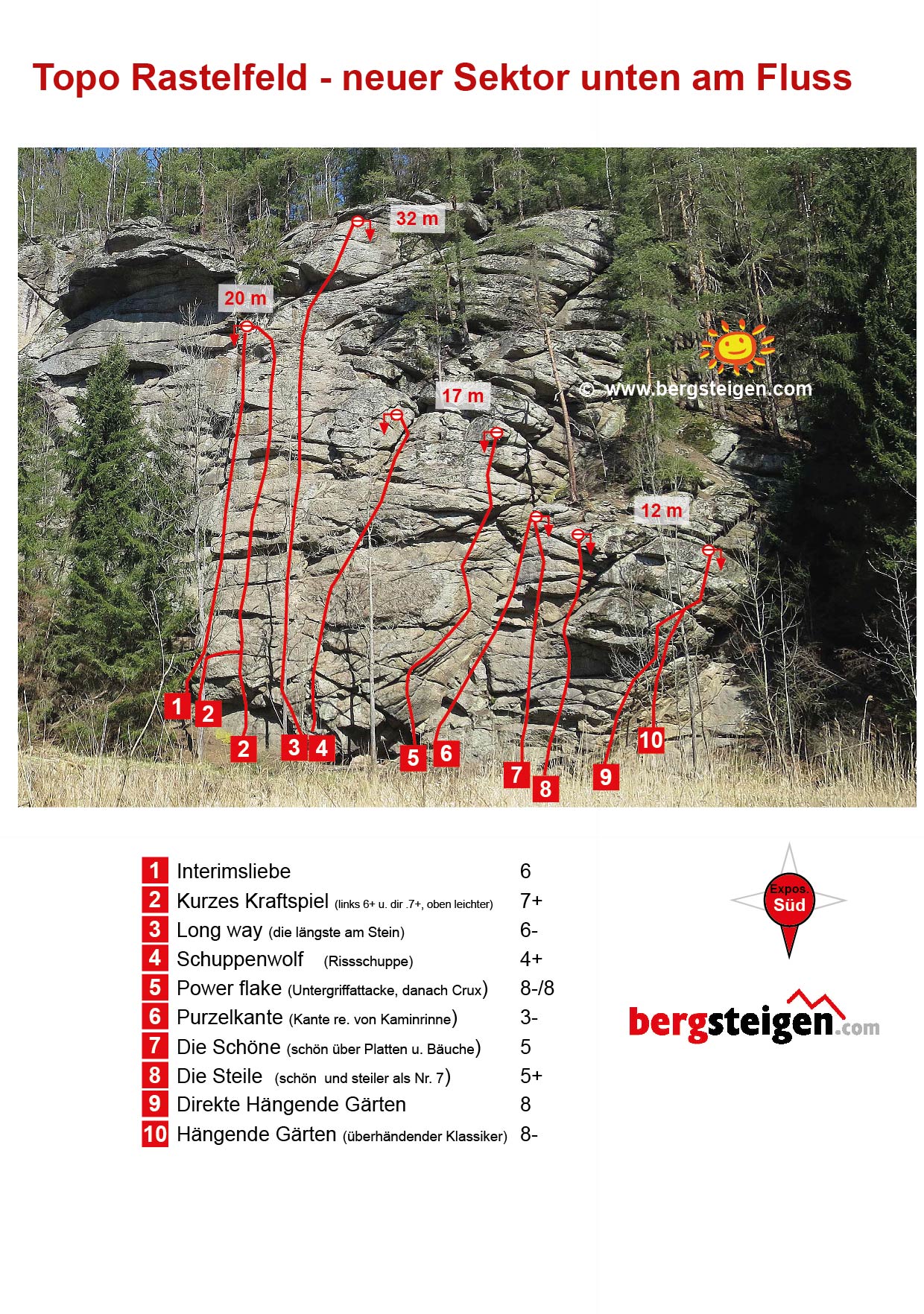 Der Klettergarten hat wunderbare 5er und 8er Touren, wie Auf geht's , Weiter geht's (5) Via Chiquita, Mir is wurscht (beide 8) in unmittelbarer Nähe (siehe Topo). Das absolute Glanzstück im High End Bereich bildet sicherlich die 15 m lange Kantenkletterei von Walk of Life, 9-, von Reinhard Fichtinger. Zuletzt hat sich direkt am Fluss ein neuer Sektor mit 9 schönen Routen entwickelt.