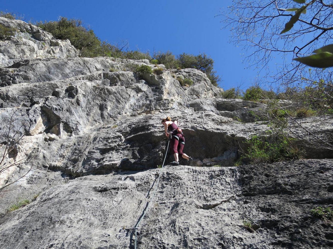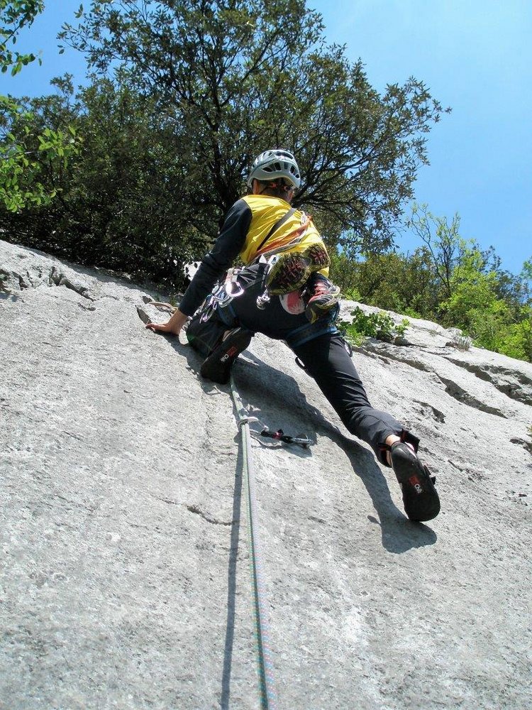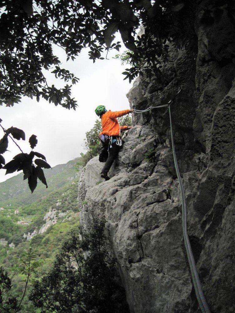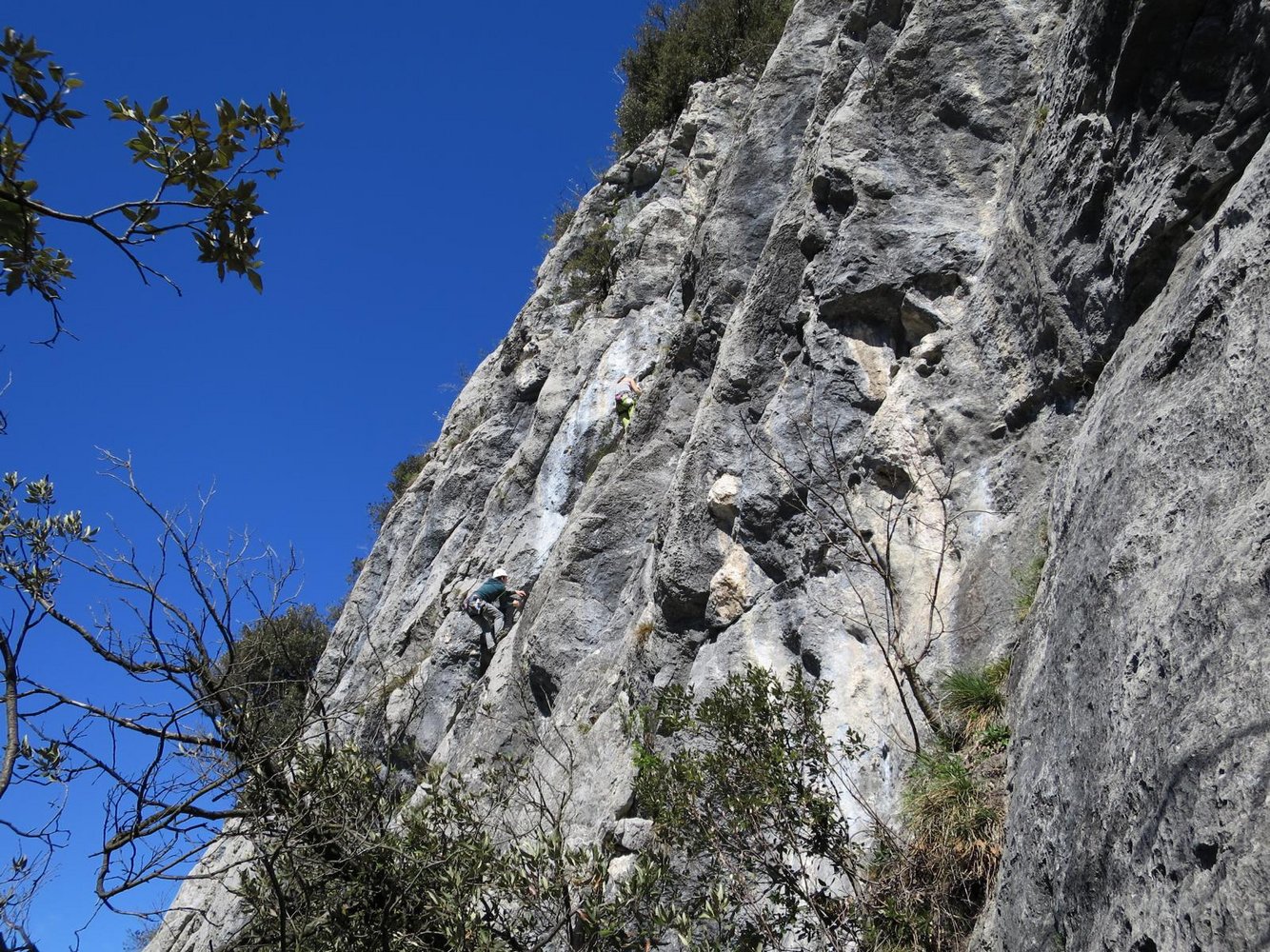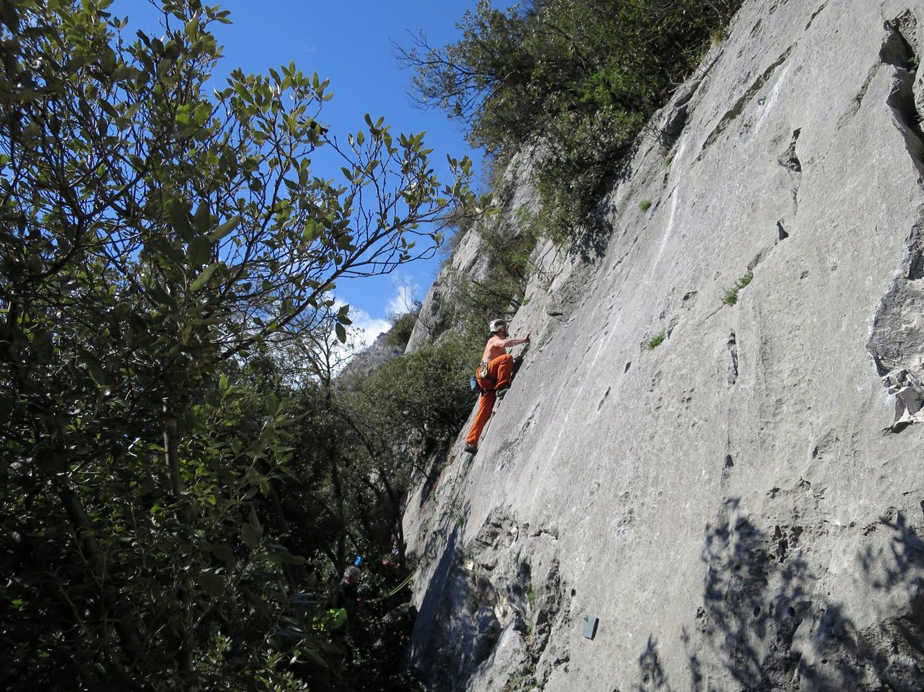 Sehr schöner und großer Klettergarten mit leichten Plaisir-Routen. Vielleicht der Top Klettergarten in Arco für Kletterer im Bereich 5-7. Die auf zwei Ebenen verteilten Touren sind nie richtig steil und perfekt mit Bohrhaken gesichert. Es gibt auch einige Mehrseillängen Touren und unter dem Gebiet noch zwei Sektoren mit ausschließlich leichten MSL Touren.