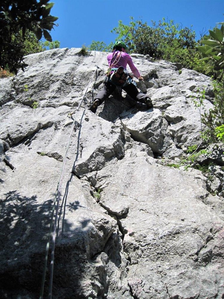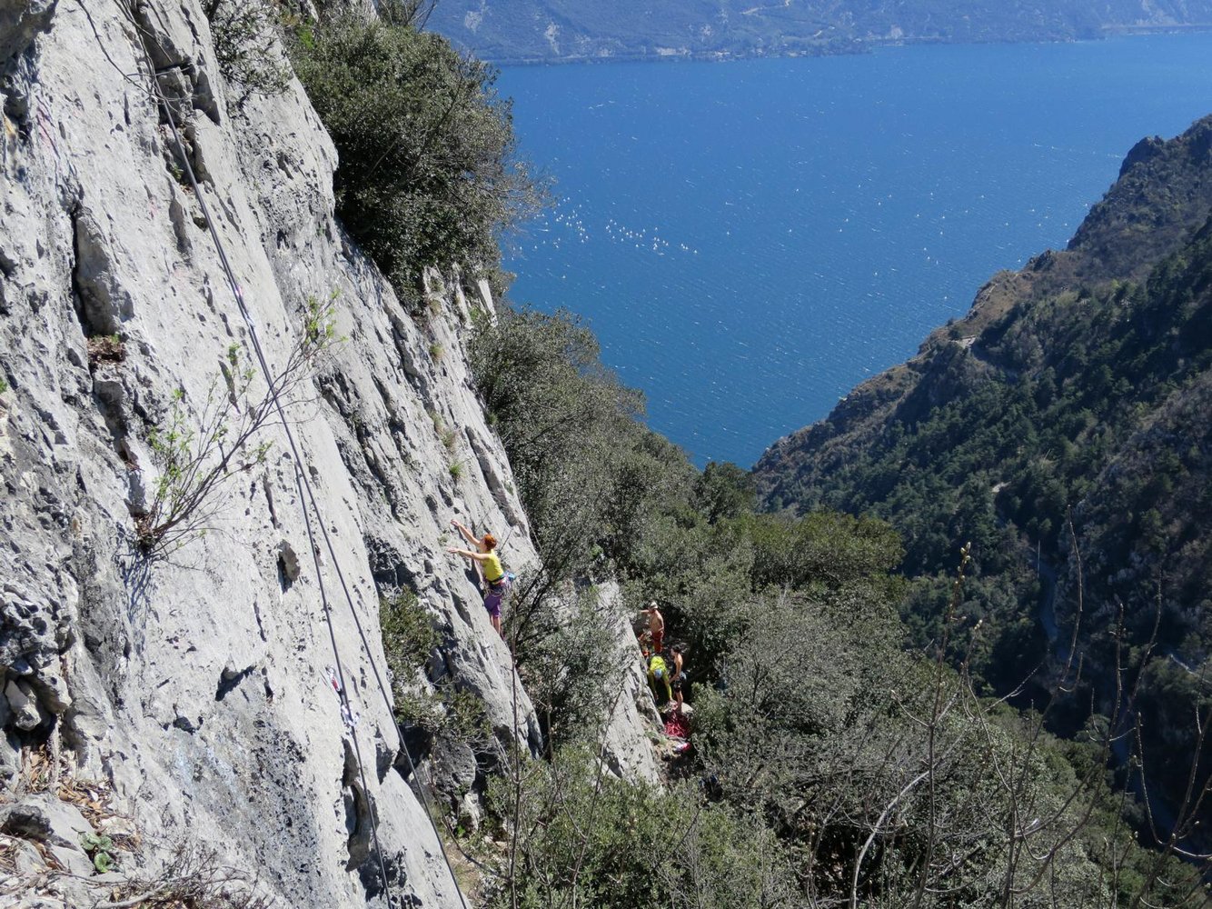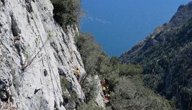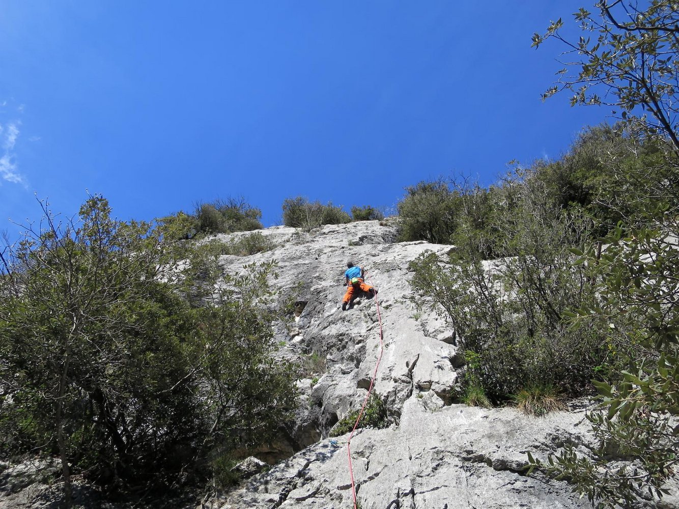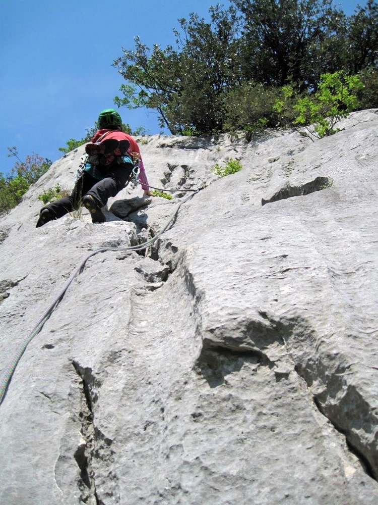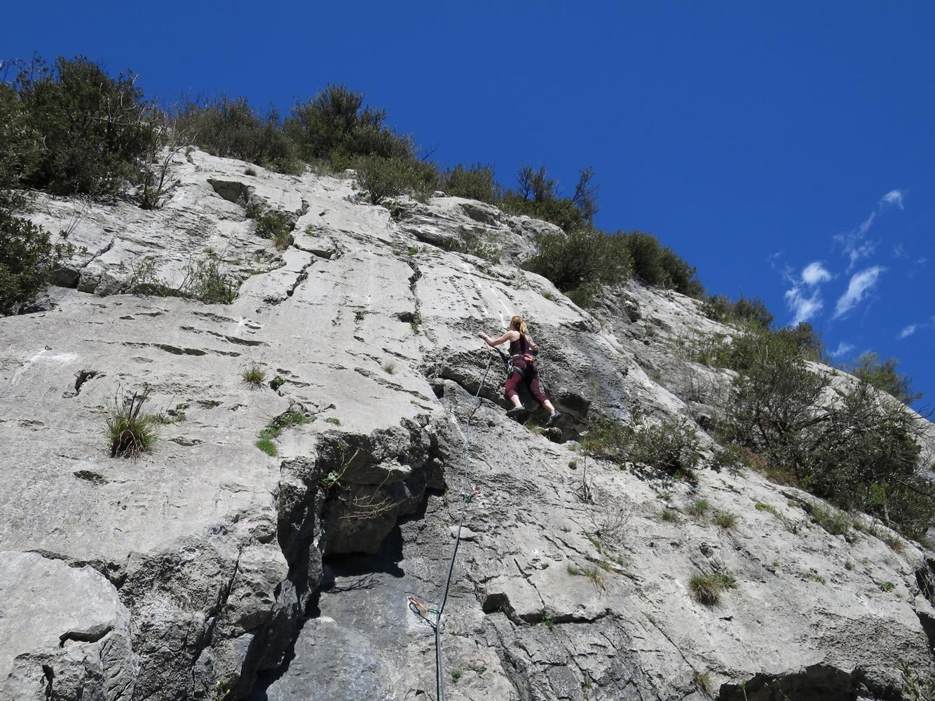 Sehr schöner und großer Klettergarten mit leichten Plaisir-Routen. Vielleicht der Top Klettergarten in Arco für Kletterer im Bereich 5-7. Die auf zwei Ebenen verteilten Touren sind nie richtig steil und perfekt mit Bohrhaken gesichert. Es gibt auch einige Mehrseillängen Touren und unter dem Gebiet noch zwei Sektoren mit ausschließlich leichten MSL Touren.