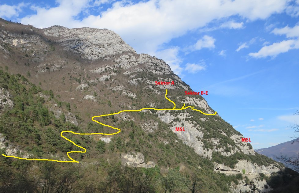 Vom Parplatz auf der Straße zum Tunnenl zurück und rechts davon auf der alten Straße (Anfangs auch durch kurzen Tunnel) ca. 300 m bis links am Ende einer kleinen Abfallenden Mauer ein Weg wegegeht. Diesem Weg zu den Sektoren folgen. Den obersten Sektor erreicht man über keienn mit zwei Steinmännern markierten Pfad der kurz vor den anderen Sektoren links abgeht.