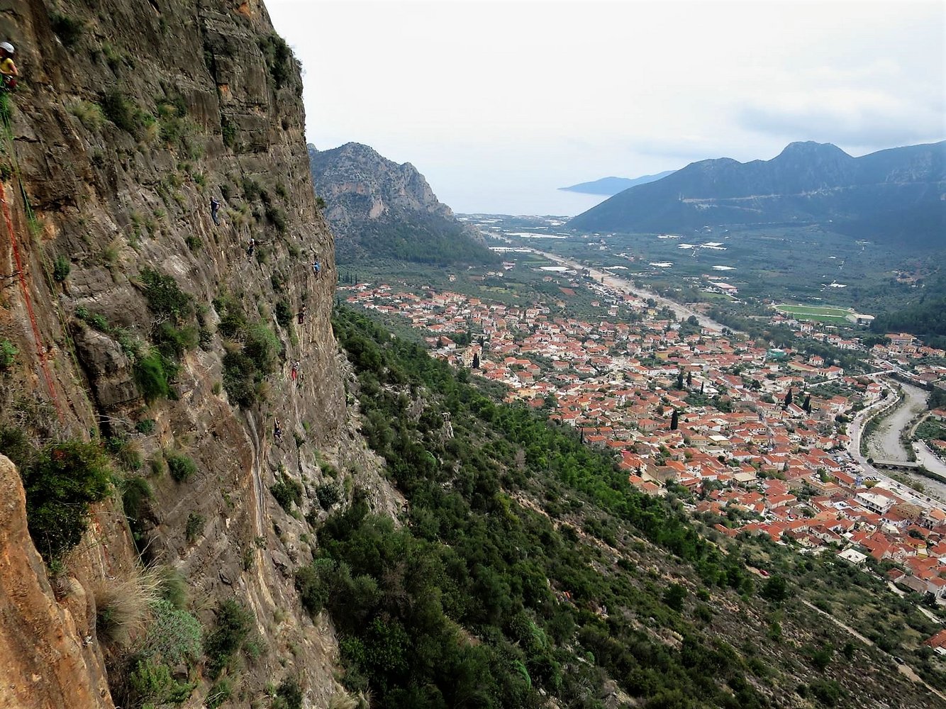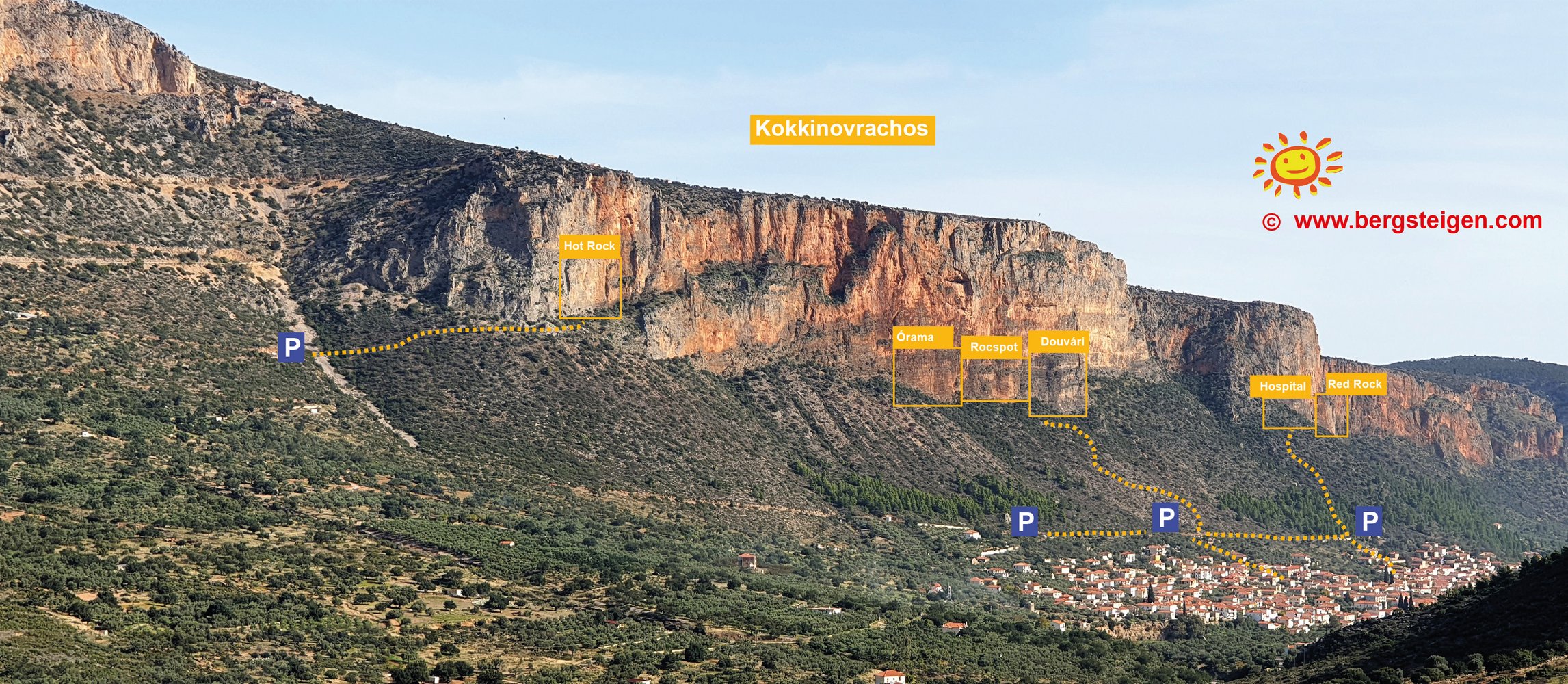 Toller Sektor in der gewaltigen roten Südwand des Kokkivrachos direkt über dem Ort Leonidio. Der Klettergarten ist den gesamten Tag über in der Sonne und daher ein perfektes Winterziel. Der rote Kalfelsen ist steil und griffig und hat sogar einige Sinter. Die Routen sind sehr lange und perfekt abgeschiert!