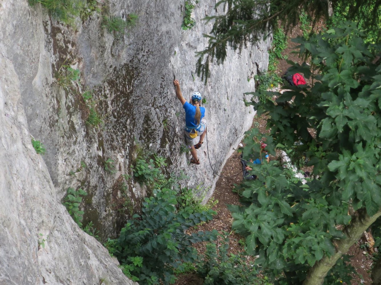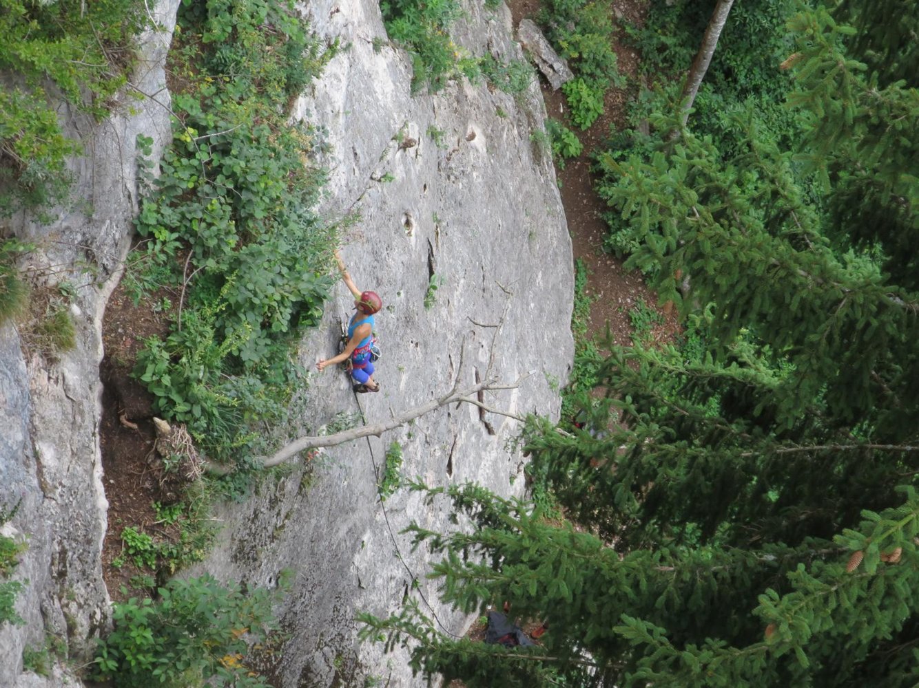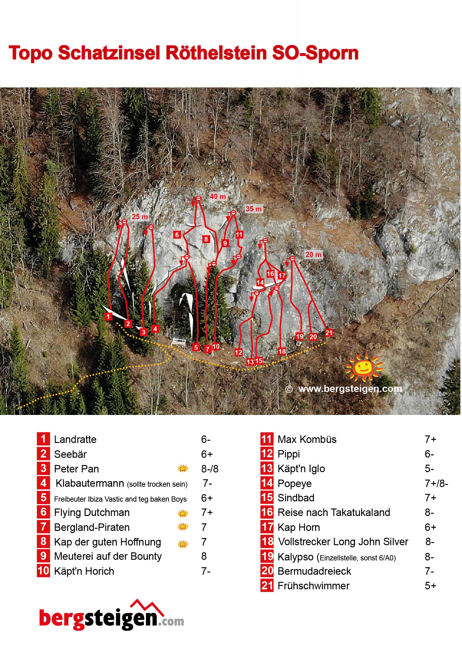 Schöner Klettergarten am Fuße des Röthelstein Südostsporns mit gut abgesicherten Sportkletterrouten. Der Fels ist plattig bis überhängend und man trifft sogar auf einige Mini-Sinter. Die Routen habe teilweise eine 2. Seillänge.