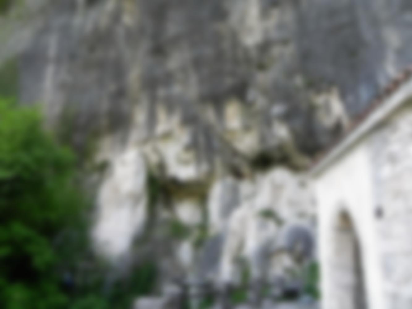Die Straße mit Fahrverbotstafel hinauf bis zu einer kleinen alten Kirche. Von hier in 10 Sekunden zur Wand.