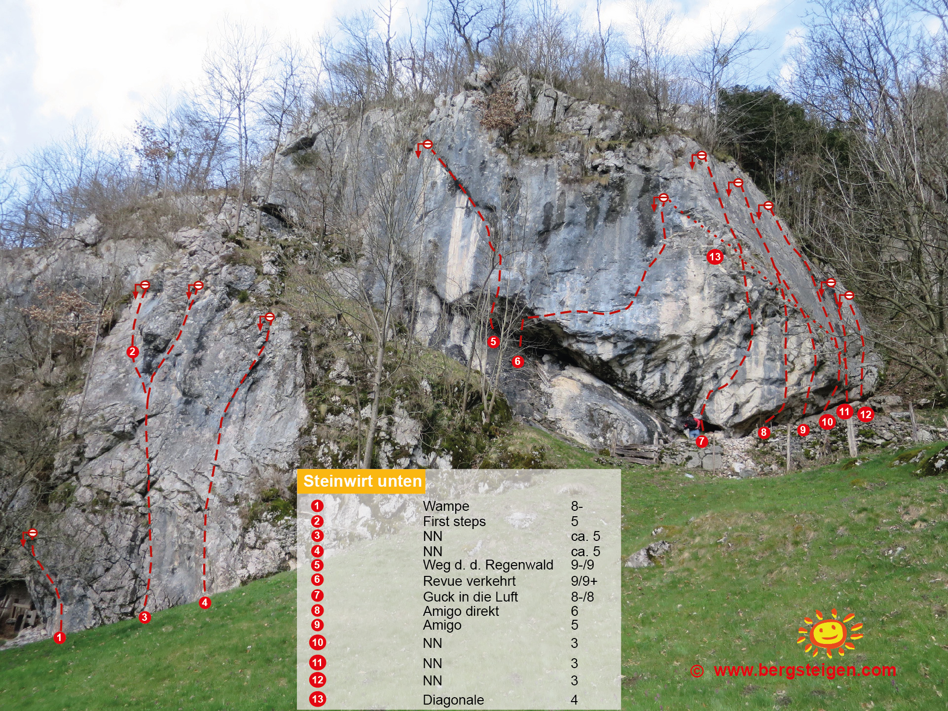 Die Wiese am Fuß der Wand wird landwirtschaftlich genutzt, deshalb bitte nur die bereits vorhandenen Wege benutzen und nicht durch die Wiese laufen, auch sonst wie überall auf Sauberkeit im Klettergarten achten.