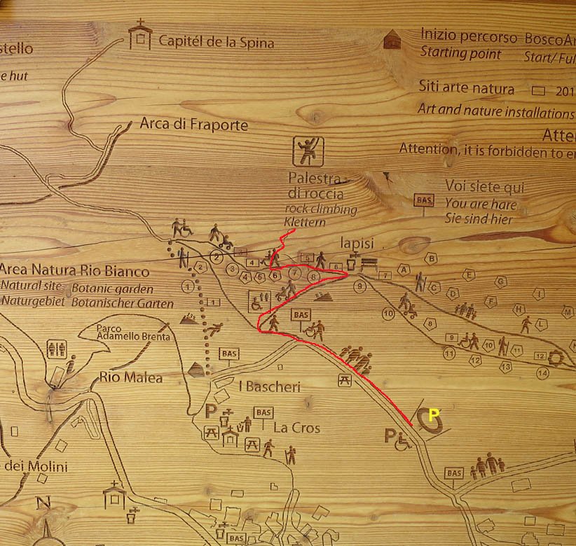Von Arco nach Sarce und dort links weiter nach Madonna die Campillio. Der Straße ca. 8 km durch Tunnels bergauf folgen bis diese wieder abfällt. Dort bei einer Kreuzung rechts über eine Brücke und weiter Richtung S. Lerenzo bis nach Villa Banale. Her links nach Stenico. Im Ort Stenico rechts Richtung Molveno und am Ende der Häuser bei eine Bushaltestelle mit Mülltonnen in links in die Via Doss Marin. Oben beim Schild Strada di Coleo rechts bis zum Ende der Fahrmöglichkeiten (Parkplatz).