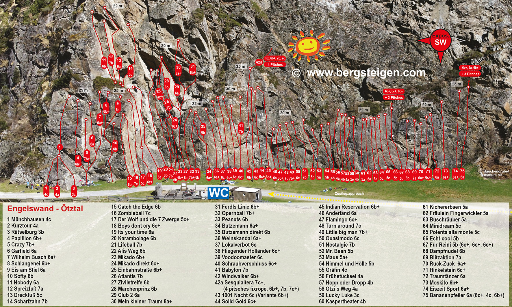 Siehe Topo und Übersichtsbild. Viele Routen sind auch mit einer Tafel (Name und Schwierigkeit) angeschrieben.