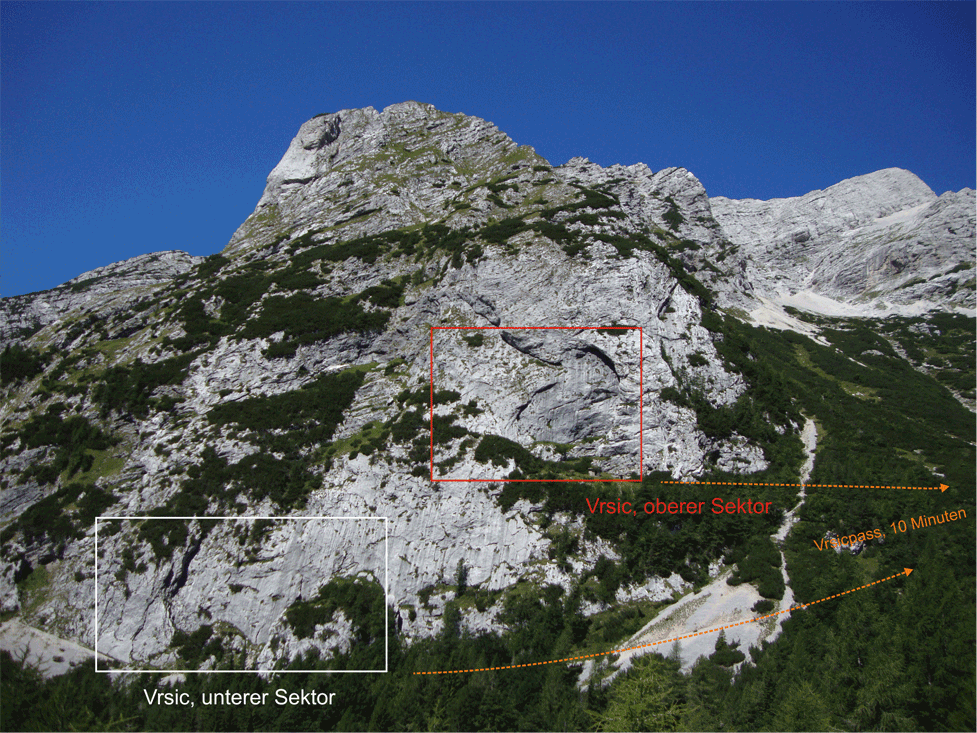 Der Untere Sektor des Klettergebiets am Vrsic bietet, gleich wie der Obere, hervorragenden Felsen. Das Klettern am teils wasserzerfressen Kalk und das herrliche Ambiente lassen keine Wünsche offen. Die Verteilung der Schwierigkeiten liegen größtenteils zwischen 6a+ und 6c, es sollte jedoch erwähnt werden, dass die Routen so gebohrt sind, dass man den Grad zwingend klettern können sollte. Im Hochsommer sollte man wegen der Hitze früh dran sein, diese lässt sich aber sehr gut mit einem Bad in der am Fuße des Berges entspringenden Soca bekämpfen. Sehr feine Location!