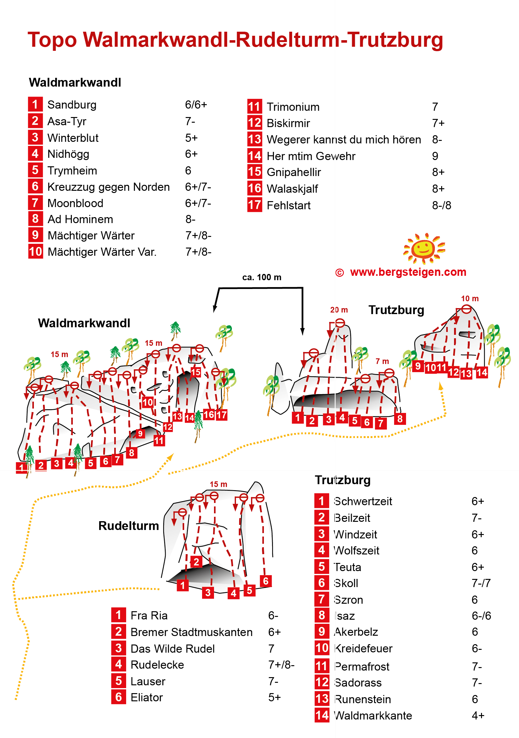 Das Gebiet besteht aus 3 Blöcken, wobei die lohnendsten Touren sicher am Waldmarküberhang sind. Die Trutzburg hat dafür leichtere Routen, der Block re. oben ist weniger lohnend.