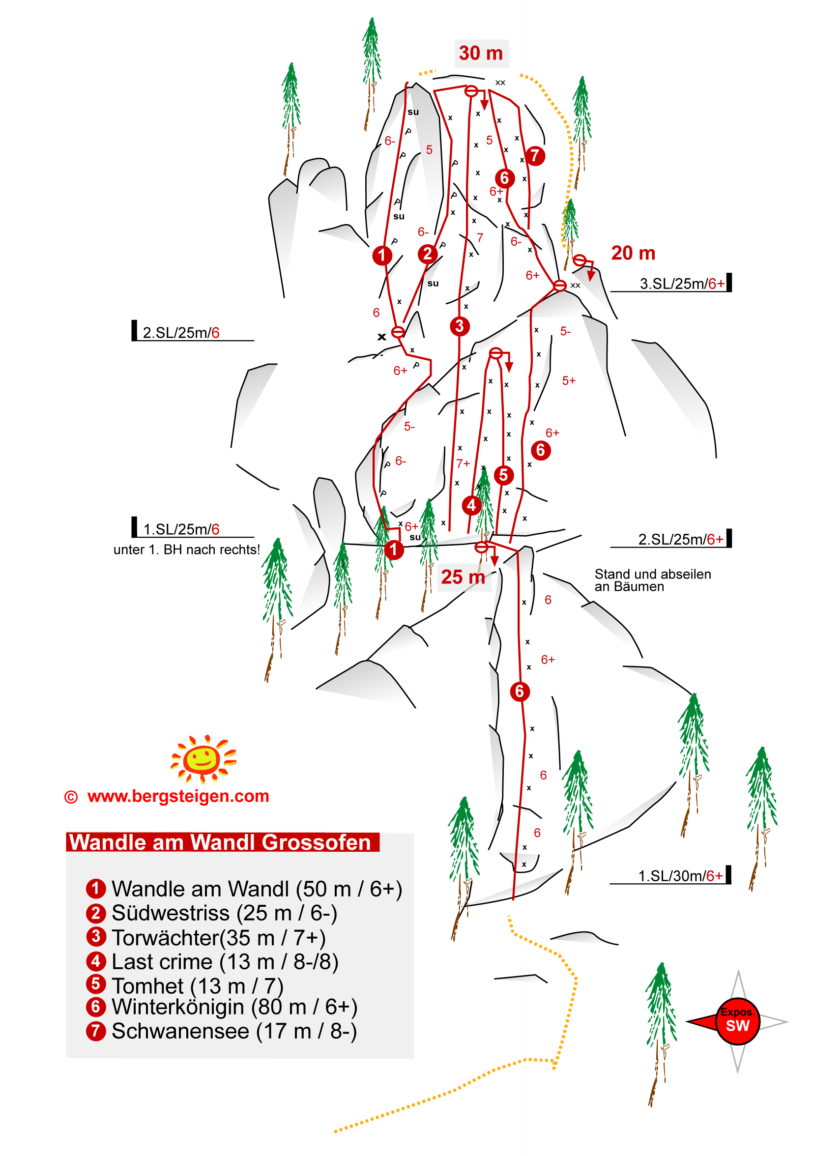 An dieser eigenständigen Wandzone rechts von Großofen warten sieben gute Routen im besten Fels. Die Route haben bis zu drei Seillängen und werden über die erste Seillänge der Route Winterkönigin erreicht. Die Absicherungen uns gut, aber nicht immer gibt es Bohrhaken, sondern auch Normalhaken und Sanduhren.