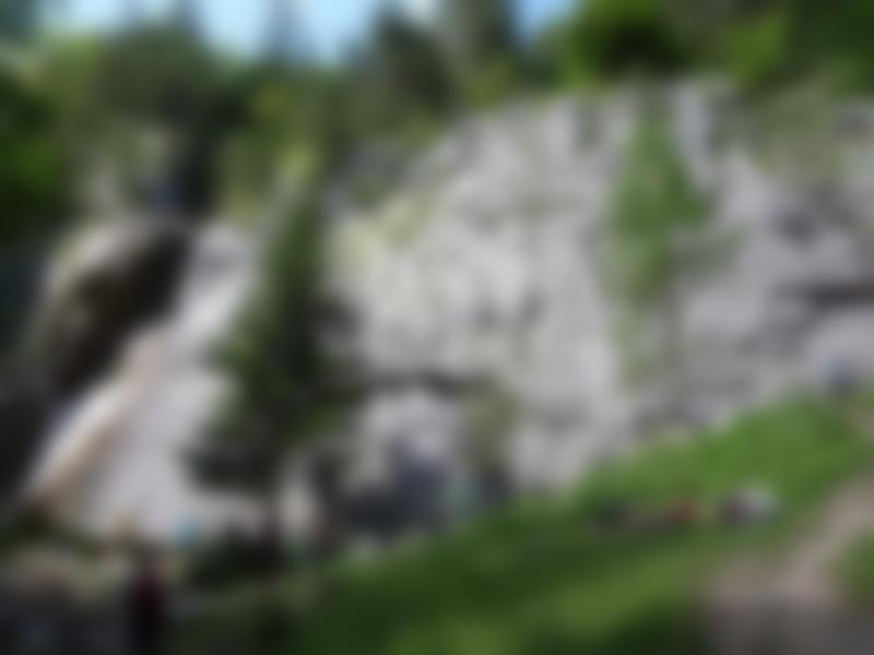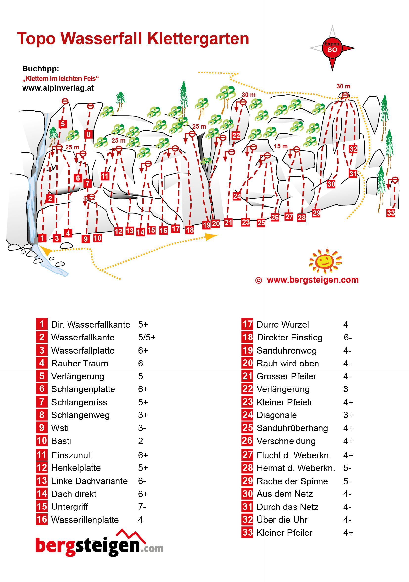 Ein perfekter Genussklettergarten neben einem wunderschönen Wasserfall. Sehr beliebt und wegen der aufgrund des Massenandrangs zeitweise erforderlichen Revitalisierungsmaßnahmen der Wiese dann leider teilweise gesperrt. Die Routen sind gut mit Bohrhaken abgesichert. Der Klettergarten ist über die Mittagszeit völlig in der Sonne, und es wird dort warm. Dank der grünen Wiese und des Baches ideal für Familien mit Kindern, die dann am Bach spielen können, während die Eltern an der Felswand klettern.