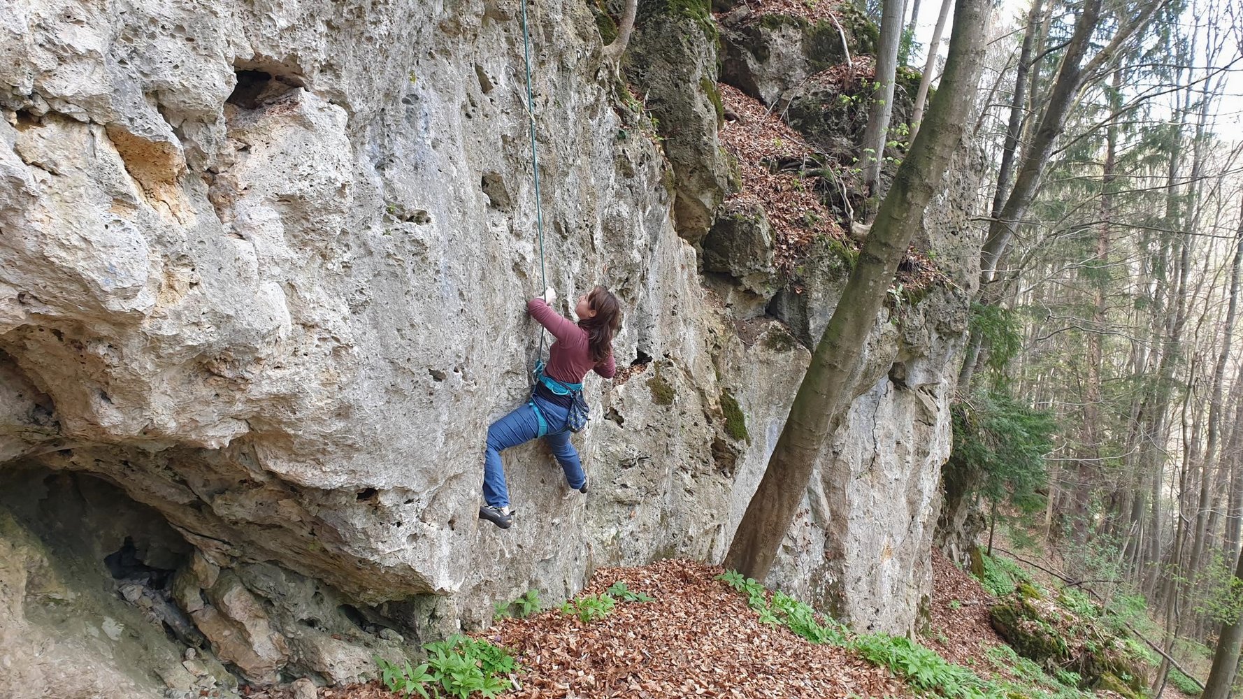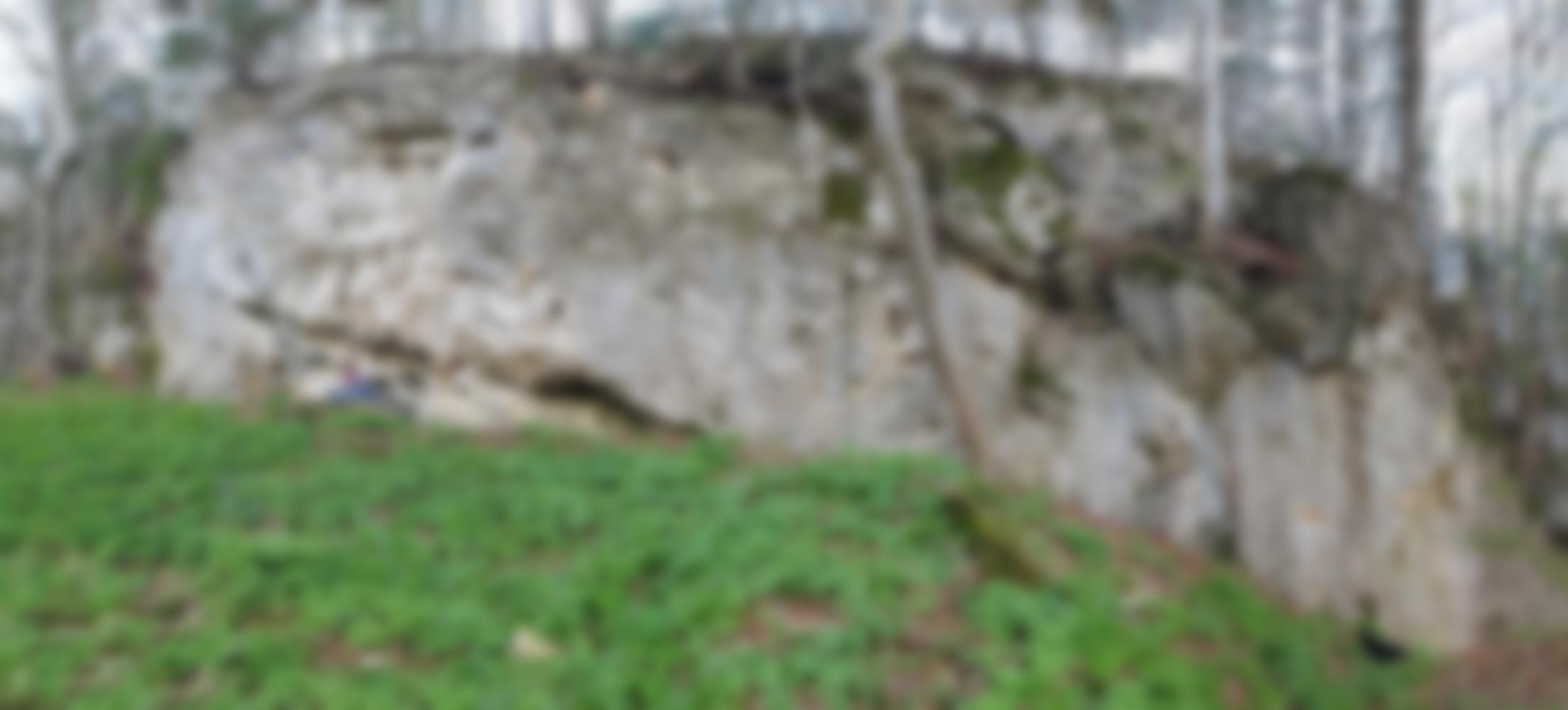 Vom Parkplatz beim Pfarrheim der Straße wenige Meter Richtung Schule folgen und davor links auf dem Promenadenweg wenige Meter nach Osten und auf der ersten Abzweigung rechts hinauf zum Wald. Die Aspahltstraße mündet am Waldrand in einer Forstraße (nicht rechts der blauen Markierung folgen). Nach rd. 200, die parallel zum Waldrand verlaufen, bleibt man auf der rechten, ansteigenden Forstraße und folgt ihr bis zur zweiten Abzweigung. Hier folgt man er rechts abzweigenden Forstraße 150 m zurück nach Westen bis zu einem Felsrücken und steigt links zur Wand auf.