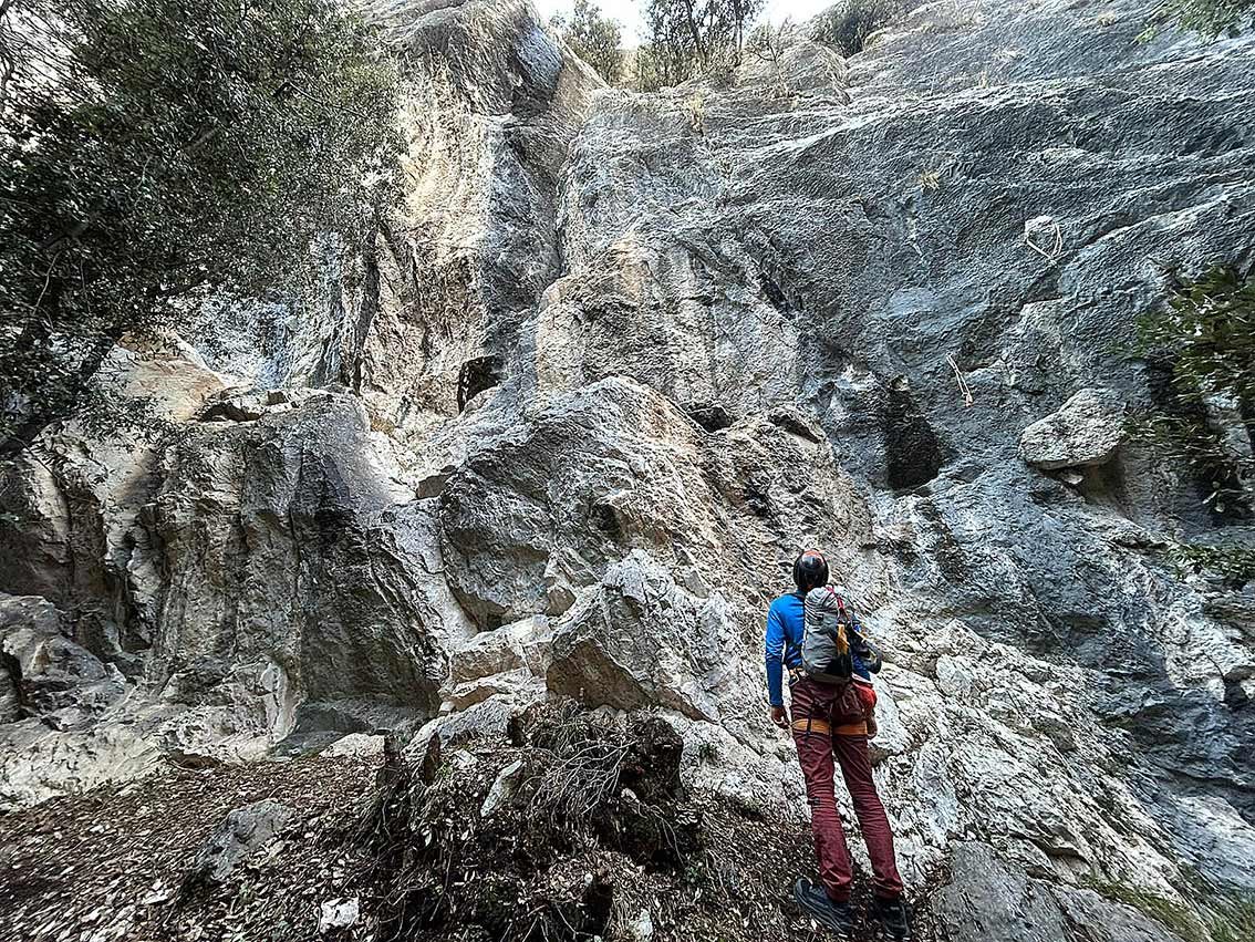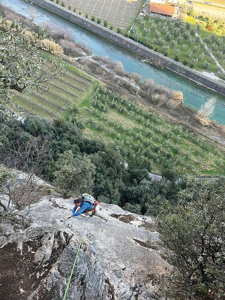 Von Ceniga über die Pont Romano, dann links entlang der Asphaltstraße bis zum Beginn des Zugangsweges zur Einsiedelei San Eremo. Dort gleich links auf einem Pfad zur Wand und dieser entlang zum beschrifteten Einstieg. Die Route Helena ist blau angeschrieben.