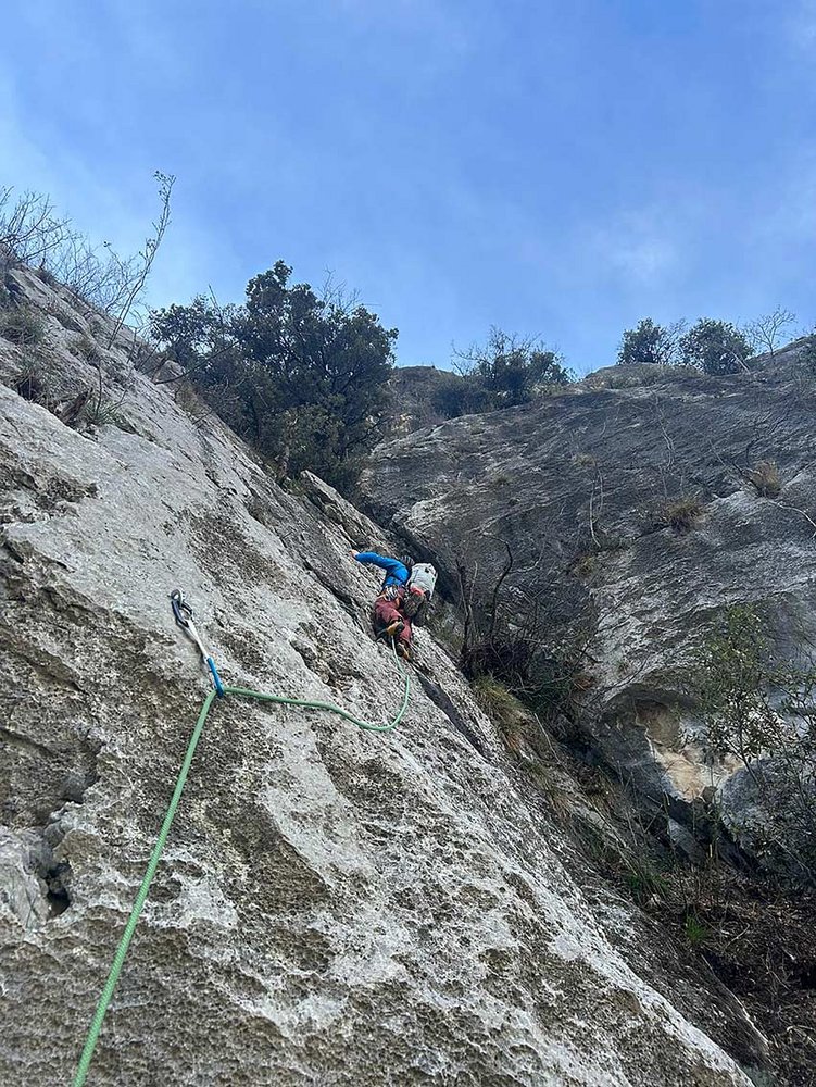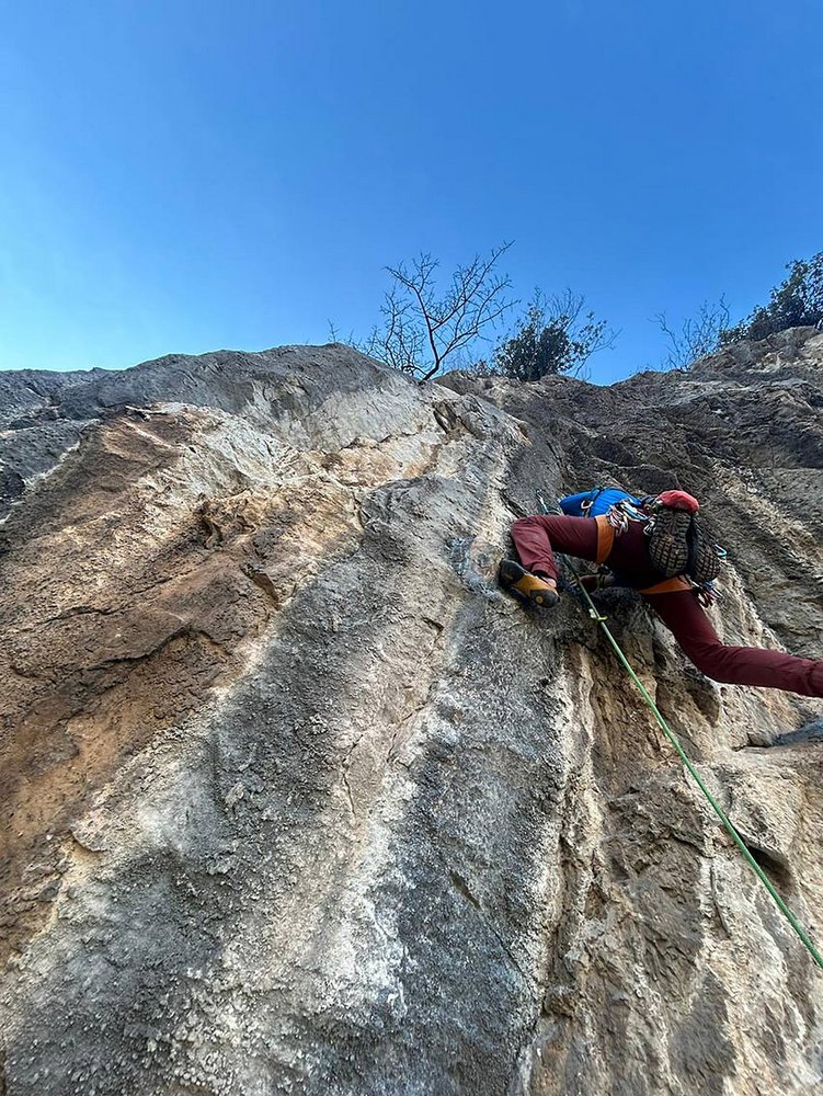 In dieser Tour gibt es geklebte bzw. gebohrte Tritte und Griffe – ähnlich wie in der Route „Il sole dell‘inverno“ am Pezol! Absicherung im Kluckner/Grill-Stil (Normalhaken, gebohrte Sanduhren, Schlingen, einige wenige Bohrhaken).