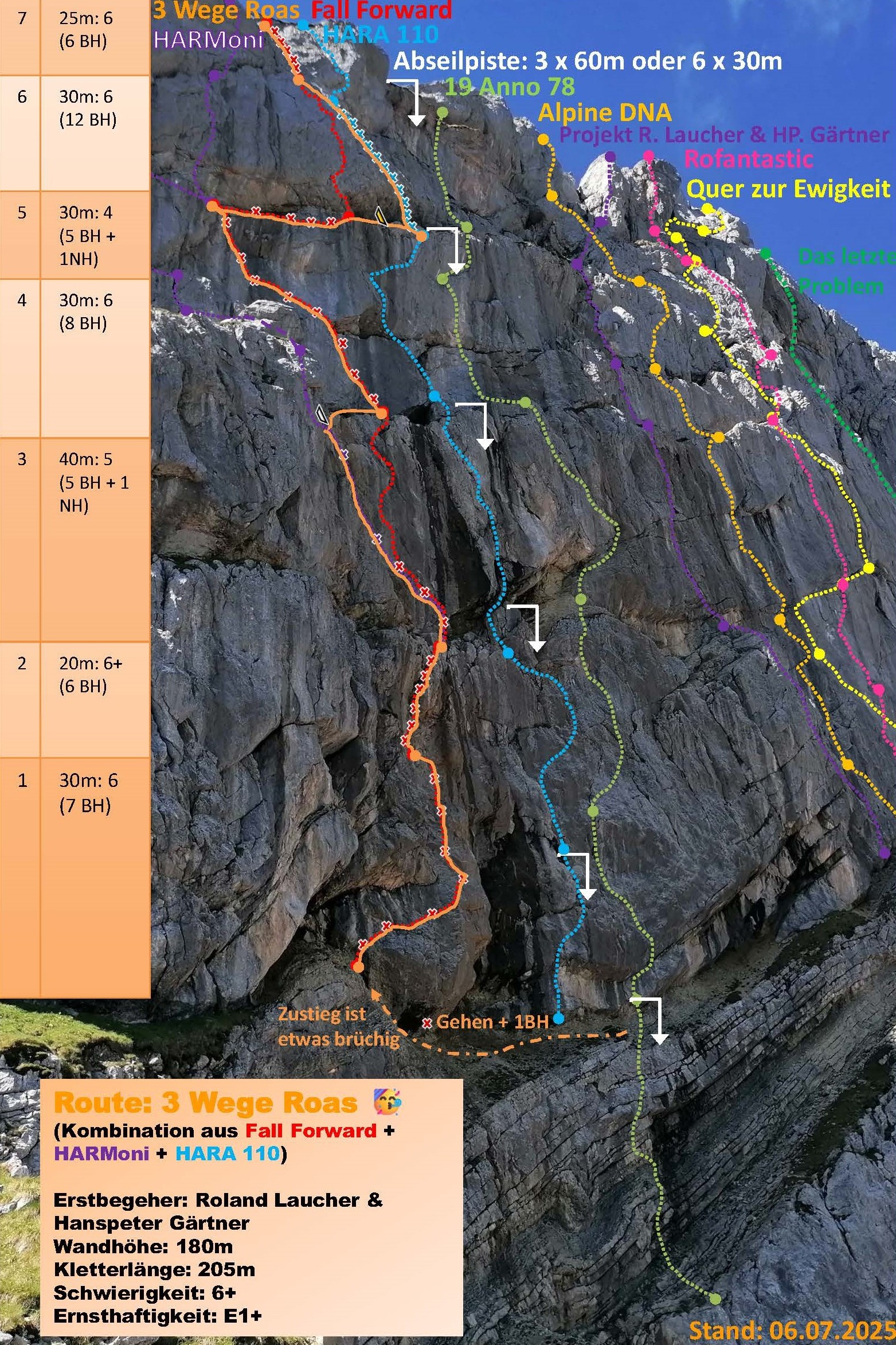 Diese Routenkombination entstand der Idee - alpinen Einsteigern und Kletterbegeisterten im 6. Schwierigkeitsgrad einen lohnenden und sehr gut abgesicherten Weg anzubieten. Eine derartige Mehrseillängen-Route gab es in den Rofan-Nordwänden bis dato nicht, womit diese wunderschöne Nordwand leider vielen Klettersportlern verschlossen blieb. Wir fanden das jedenfalls schade und suchten eine Lösung, und wir waren uns einig, dass es ein natürlicher Weg sein musste. Eine Neutour im unteren Schwierigkeitsgrad ist definitiv unmöglich. Durch diese geschickte Kombination inkl. Verbindungswege von Seillängen aus unseren drei bestehenden Routen ergibt sich ein Weg im 6. Schwierigkeitsgrad.