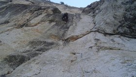 Diese Route in der Blechmauer ist eine ganz neue super Linie im Bereich der Blechmauernverschneidung. Die Route ist ganz im "Plaisir Stil" gesichert, dass heißt man braucht nur Expreßschlingen und Helm. Der Fels muß aber noch etwas abgeklettert werden (bei uns lösten sich durch Berührung mit der Kletterhose die Schuppen, also Helm nicht vergessen). Die Erstbegeher setzten dafür aber sehr viele Bohrhaken, sonst wären sie wohl mit dem Putzen heute noch nicht fertig. Man sollte den siebten Grad aber beherrschen, um in dieser Route auf seine Rechnung zu kommen.