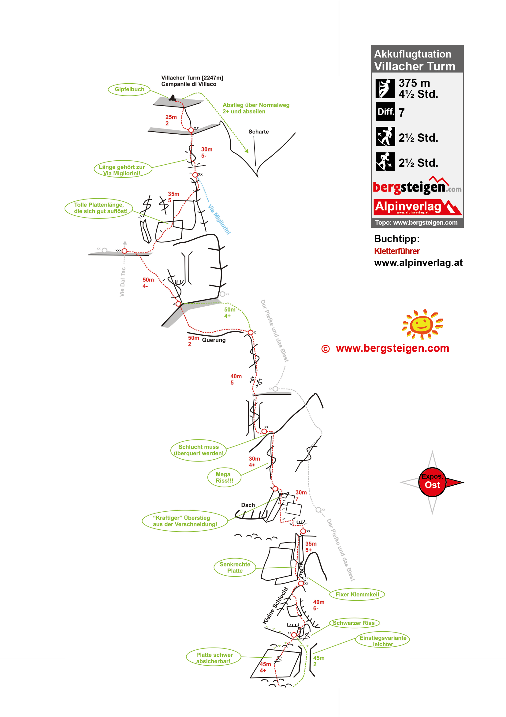 Ähnlich der benachbarten „Der Piefke und das Biest“, wobei die Schlüssellänge etwas schwerer ist. Abwechslungsreiche Kletterei an Platten, Rissen, Verschneidungen und Schuppen, wobei der Fels ebenfalls wieder top ist. Mit Ausnahme der Querung in der 7.Seillänge, die von den Schwierigkeiten etwas abfällt, alles samt sehr schöne Kletterlängen.