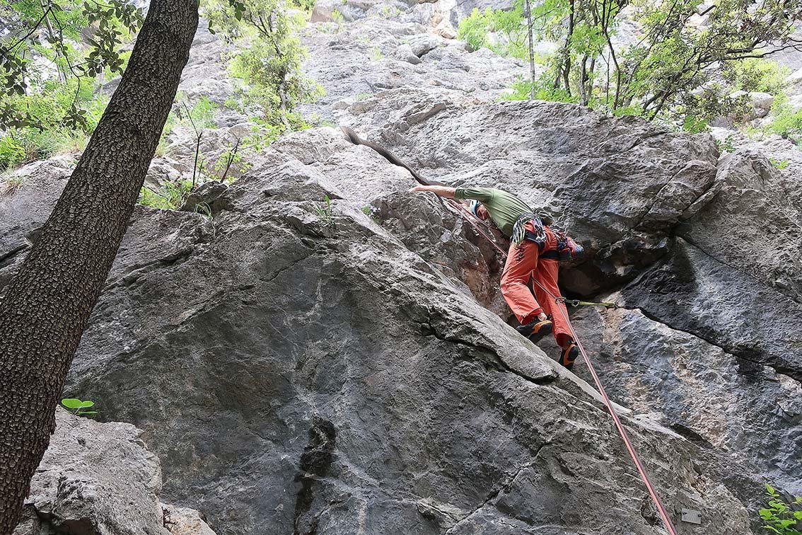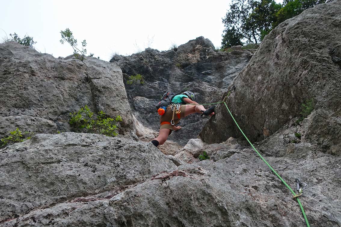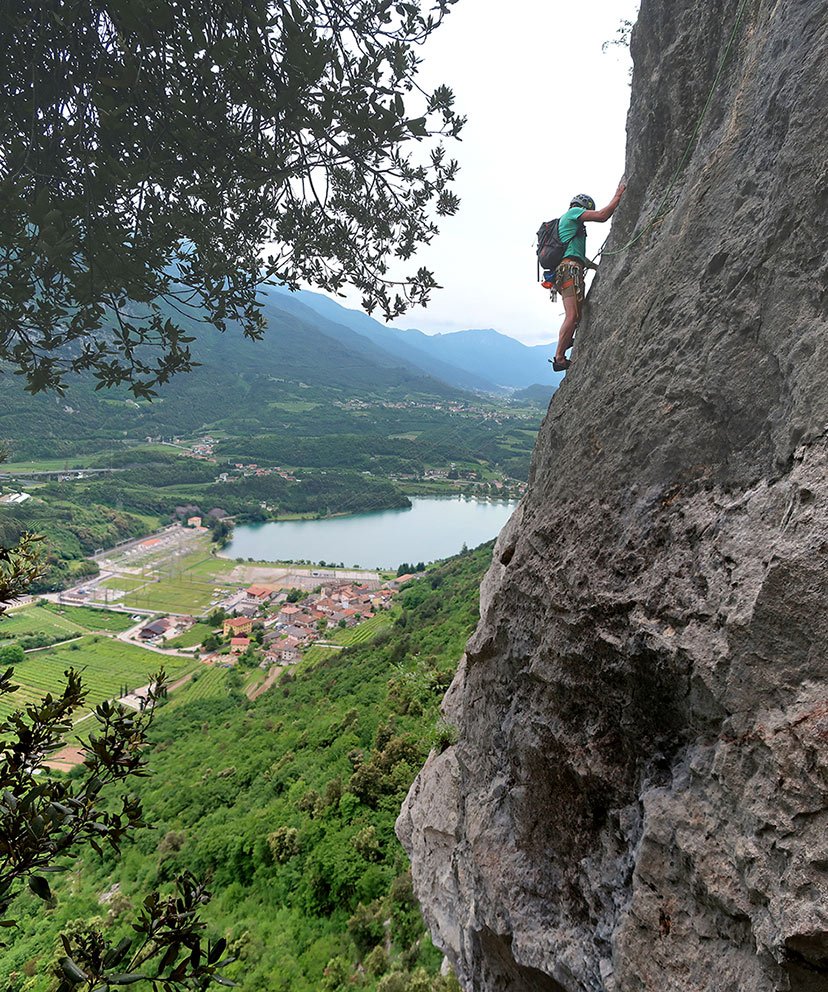 Die Route Alba Corallina zeichnet sich durch wirklich fantastischen Fels aus. Über Risse, raue Platten und Verschneidungen und kleine Überhänge klettert man an den linken Rand der Rupa di Santa Massenza. Eine lohnende, von den Erstbegehern wirklich gut herausgearbeitete Tour im hinteren Sarcatal.