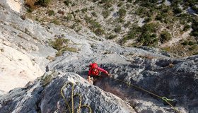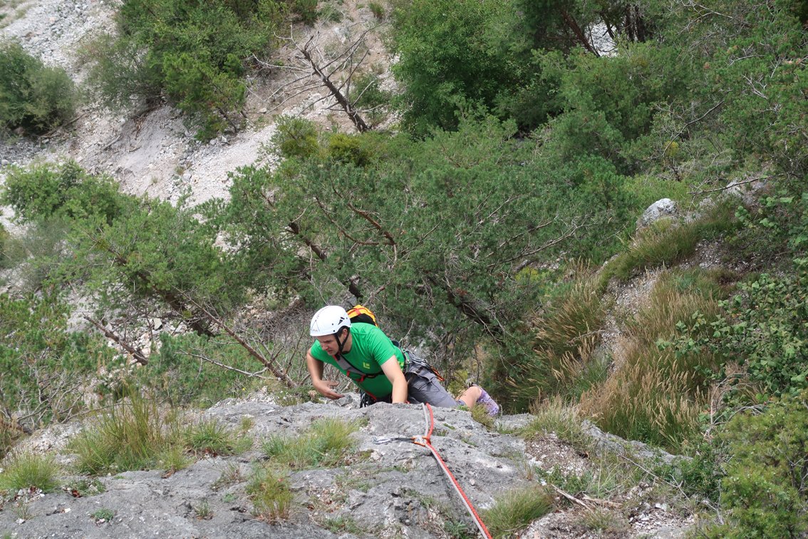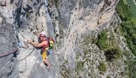 Der Fels ist nicht immer fest. Die Absicherung ist jedoch sehr gut, deshalb stören die brüchigen Passagen auch weniger. Achtung: Die letzten 2 leichten Seillängen verlaufen durch Schotter - keine Steine lostreten!