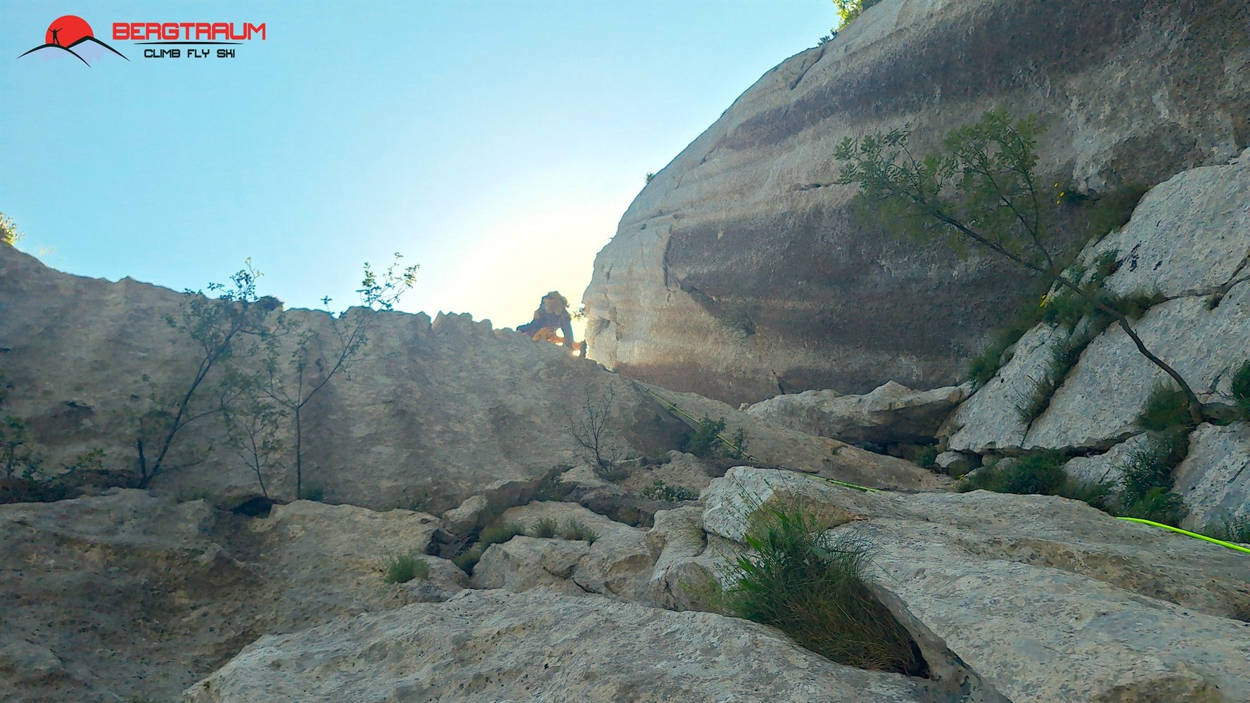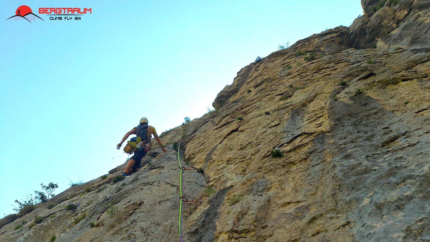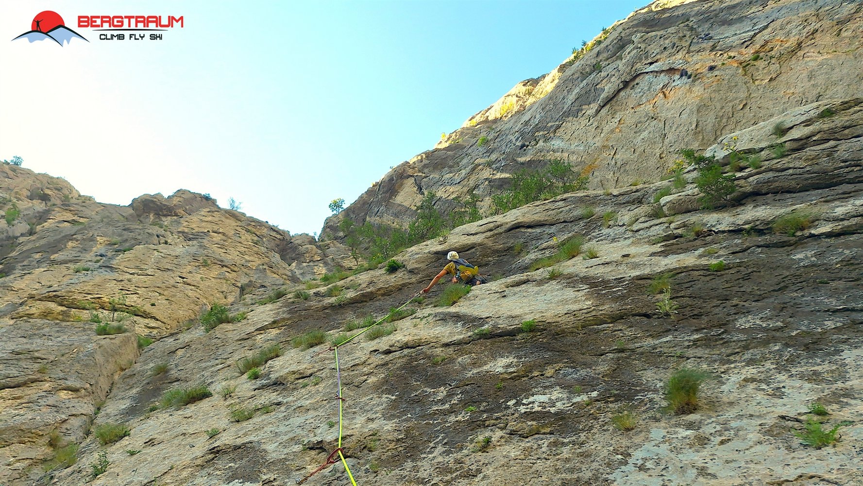 L5- 6b+: wiederum anfangs sehr steil, dann flacher zum Stand.
