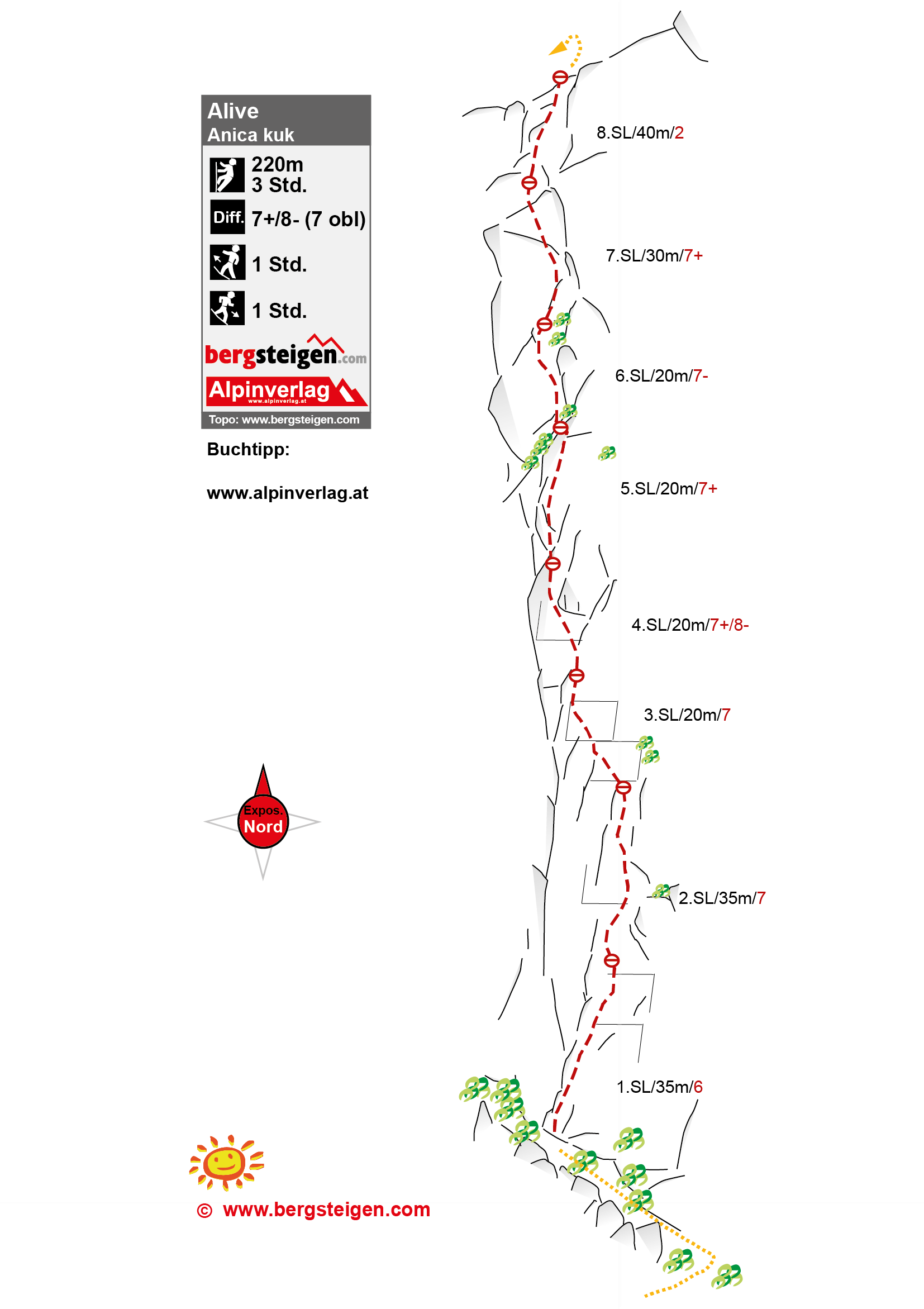 Vom Parkplatz des Nationalpark Parklenica/Velebit auf dem Wanderweg in die Schlucht. Nach rund 15 Minuten, bevor der Weg etwas abflacht, zweigt ein beschilderter Weg nach rechts zum Anica Kuk ab. Diesem folgt man noch ca. 100 Meter. Bei der folgenden Abzweigung gelangt man rechts zum Sektor Stup und links zu den Sektoren Trapez, Klin, und der NW sowie N-Wand. Hier links weiter. Diesen Weg bis vor die Hochfläche folgen. Bei Tafel „Ljubljanski“ rechts weiter unter die N- Wand des Sjeverna stijena. Der Einstieg befindet sich rund 50 Meter links der Ljubljanski bei einem neuen silbernen Normalhaken.