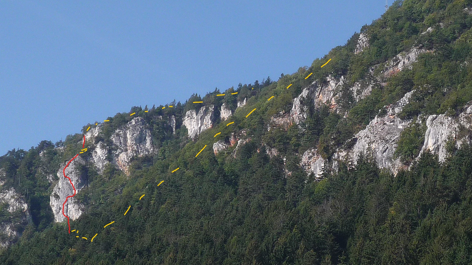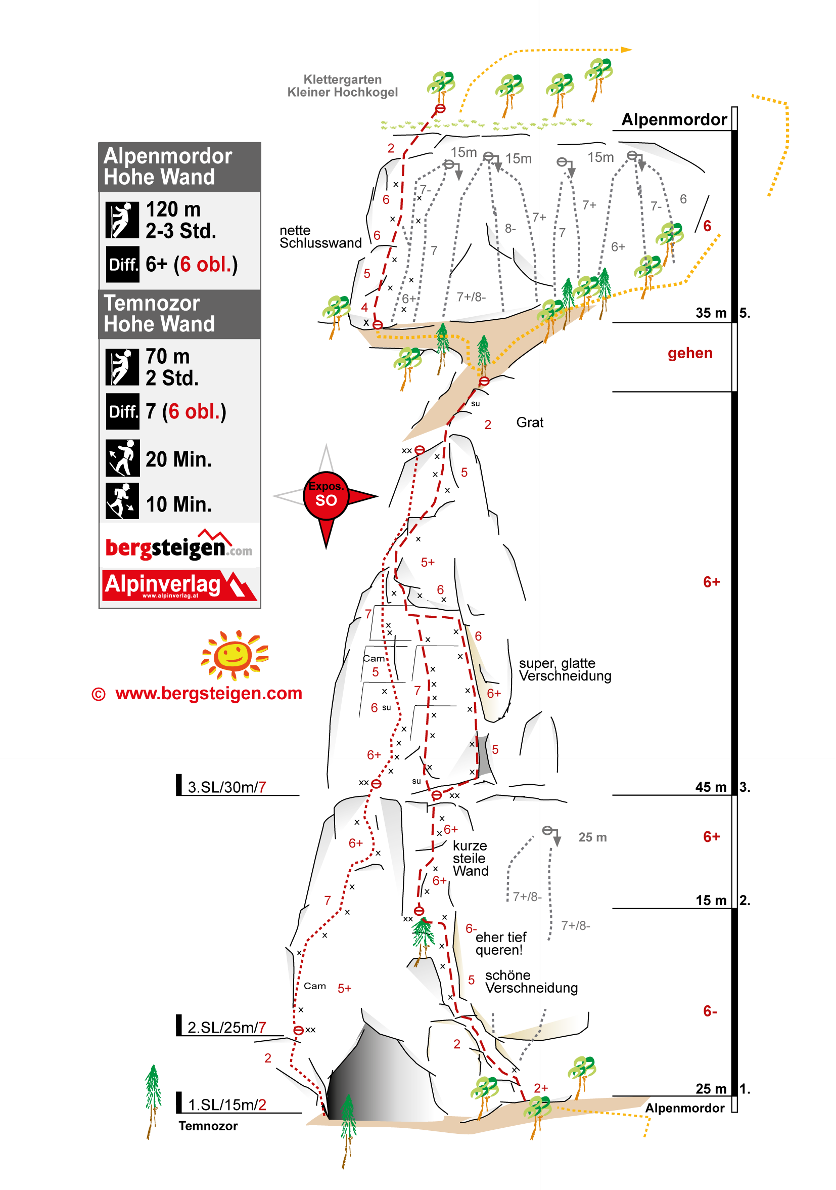 Vom Parkplatz beim Hochkogelhaus dem Weg Richtung Hubertushaus für rd. 300 Meter folgen bis dieser bei einer Wiese mit Holzbank wieder nache an die Wand kommt. Direkt unter der Bank erkennt man den ersten roten Punkt des Promenadengrats (1). Diesen Grat so weit absteigen bis man nach dem zweiten Gratstück am Beginn eines Schlags gut 100 Meter über dem markanten Strommast rechts die Wand sieht. Nun weglos und etwas müuhsam nach rechst zur Wand queren und wieder etwas zum Wandfuß aufstiegen. Den Wandfuß erreicht man in einer Rechstschleife, der E ist rechts neben der Markanten großen Nische.