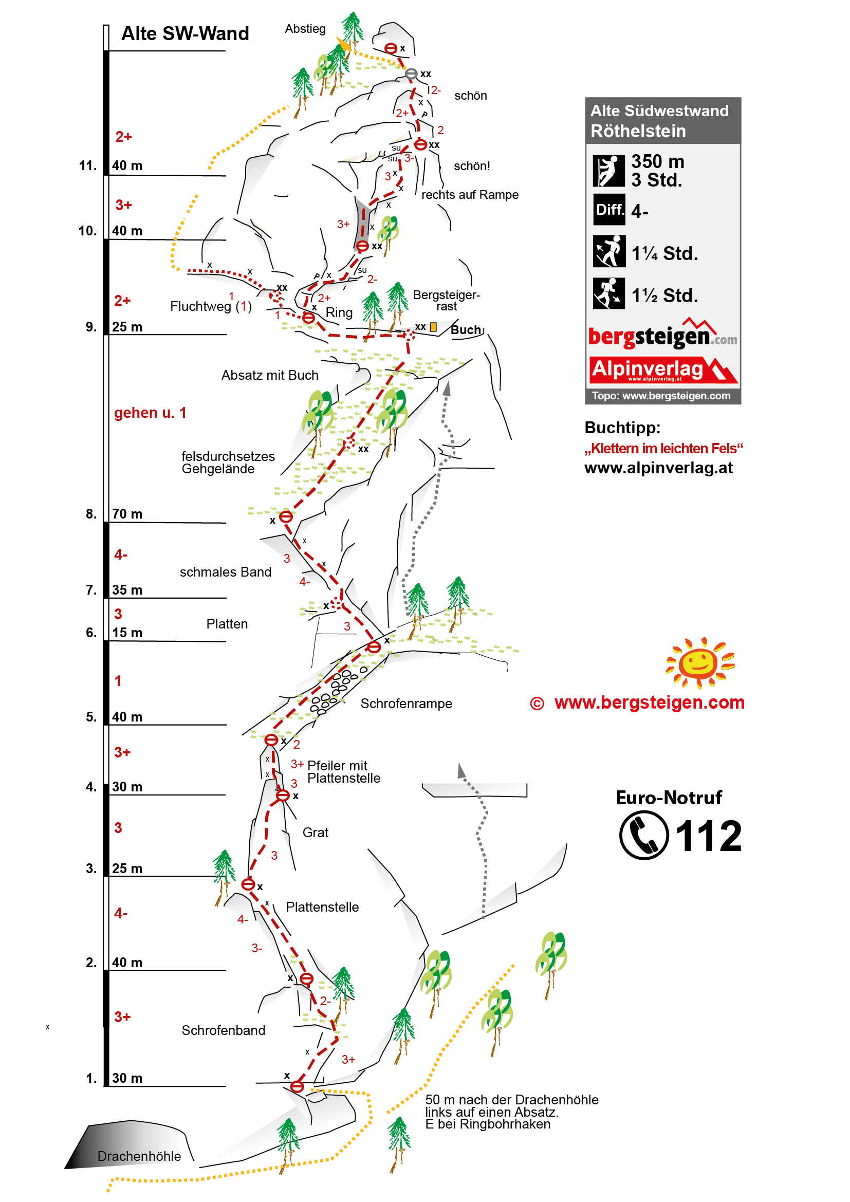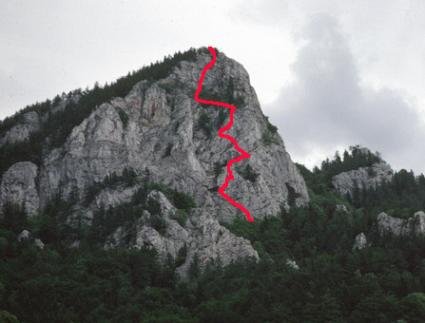 Vom Einstiegshaken (Ring) rechts aufwärts zum Baum und dann wieder links zum ersten Stand. Durch eine Verschneidung und über einen Pfeiler zum ersten Gehgelände. Über tolle Platten unter einem Überhang gehts zu einer ausgesetzten Querung! Nun wieder Gehgelände und zum Wandbuch. Die letzten Längen in einer Scharte aufwärts zum Ausstieg.