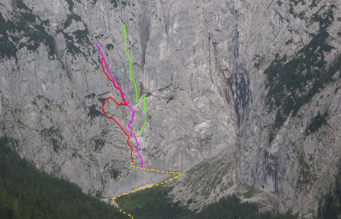 Fußabstieg (ist aber heikel): Vom Ausstieg ca. 100 m aufwärts zum "Jägerwiesensteig" (markiert). Diesem folgt man auf- und absteigend nach links ca. eine halbe Stunde bis zu einem markanten Baum. Dort weiter, erst nach einem Gegenanstieg (ca. 50 Hm) steigt man dann in einer Rinne hinunter zum Wandfuß.