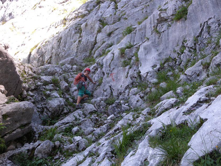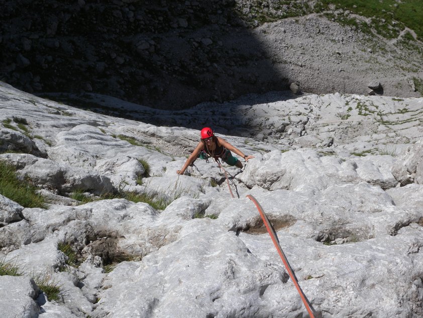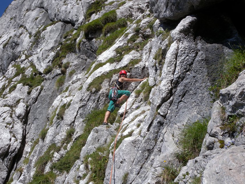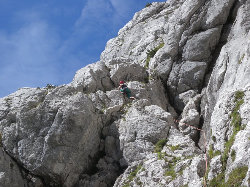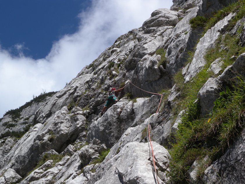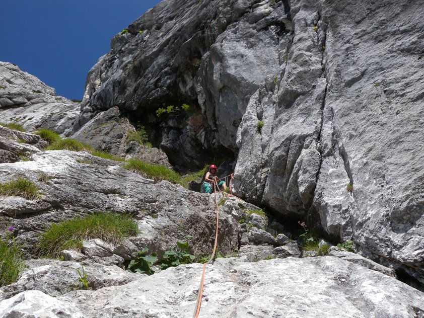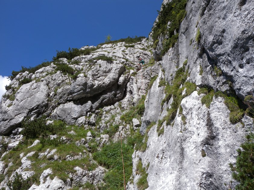 10. SL: Gestuft, links ansteigend auf einer leichten Grasrampe zu einem Zwischenstandplatz in einer engen Rinne (unterhalb einer kaminartigen Steilstufe). Vom Zwischenstand leicht links haltend hinauf zu einem alten Haken, dann aber wieder nach rechts steiler aber griffig hinauf zum Standplatz.