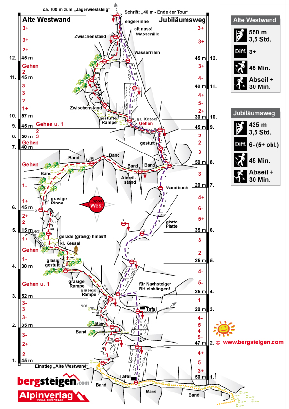 9. SL: Nach links aufsteigend gehen, dort wo das Gelände steiler wird gerade hinauf zu einem Standplatz (Metalltafel am Stand: links Alte Westwand, gerade Jubiläumsweg).