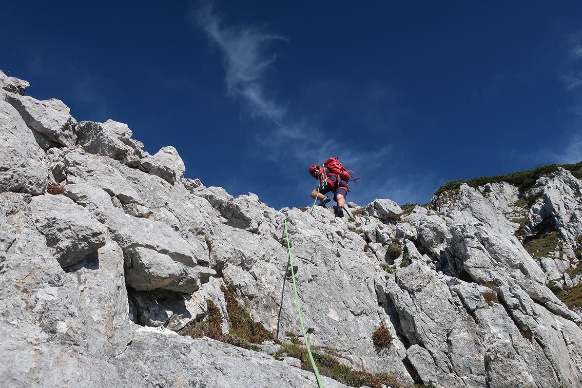 Der Anstieg ist für den Schwierigkeitsgrad gut mit Bohrhaken und Haken gesichert, in der ersten Seillänge sind die Abstände etwas weiter.