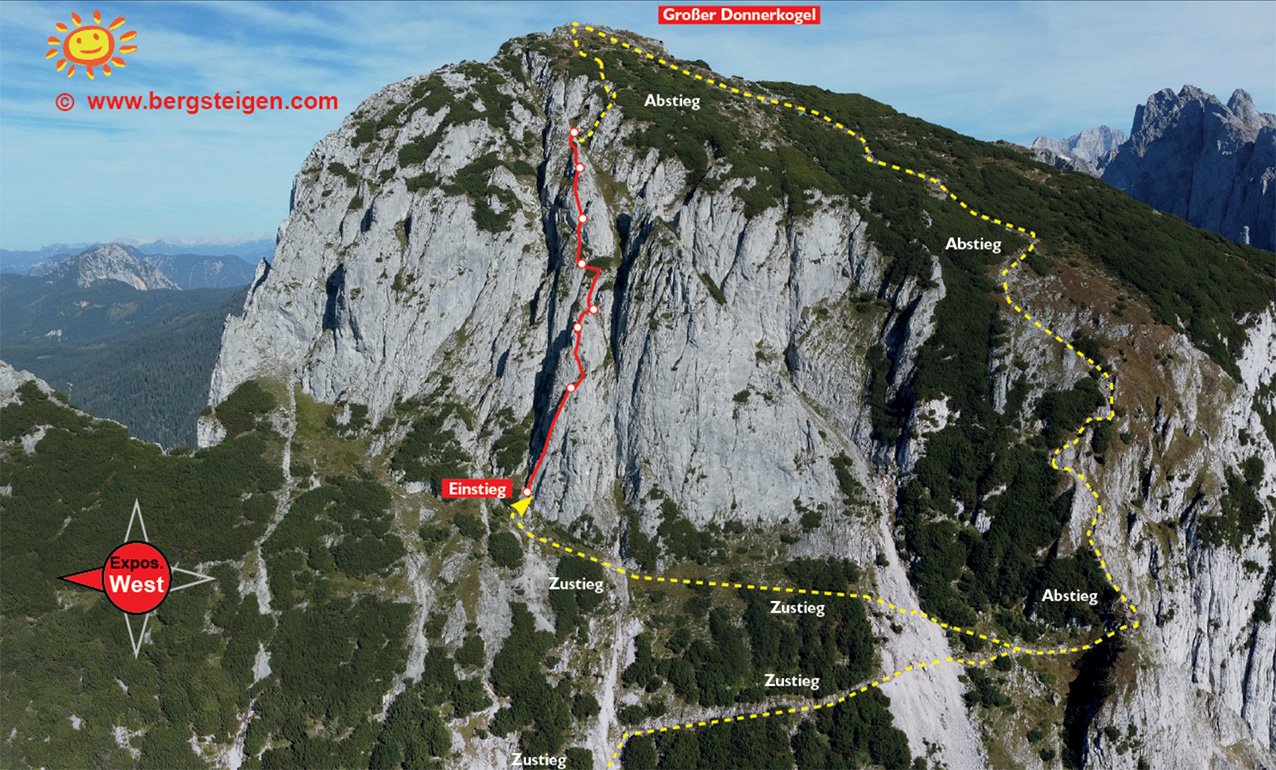 Vom Parkplatz zur Gosaukammbahn oder zu Fuß (ca. 1 Std.) zur Gablonzerhütte. Von der Hütte auf dem Weg in den westlichen Törleck-Sattel zu einer Weggabelung. Dort links (Wegweiser „Donnerkogel“) auf dem Weg bis unter die Westwand (dort wo der Weg unterhalb der Felsen waagrecht verläuft). An geeigneter Stelle (nach dem zweiten kleinen Schuttstreifen, der vom Weg hinunterzieht; in diesem Bereich kann man auch gut Material deponieren) den Weg nach links auf einem Pfad verlassen und unterhalb der Felswände zum Einstieg am Fuß des Pfeilers in Wandmitte queren. Der Einstieg ist am linken Rand des Pfeilers in einer kleinen Rinne bei Bohrhaken und Normalhaken (die verblasste Einstiegsaufschrift ist nur noch teilweise zu erkennen) am Fuß einer Gratrippe.