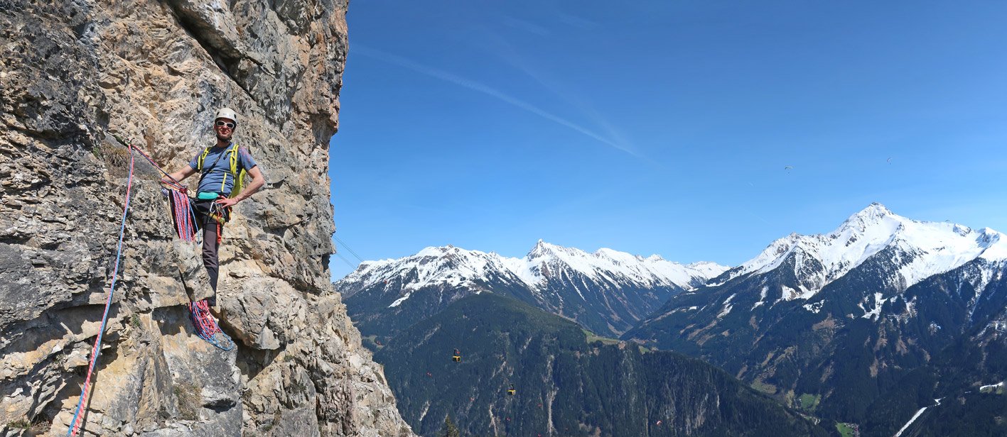 60 m Einfachseil, Helm und 10 Expressschlingen.